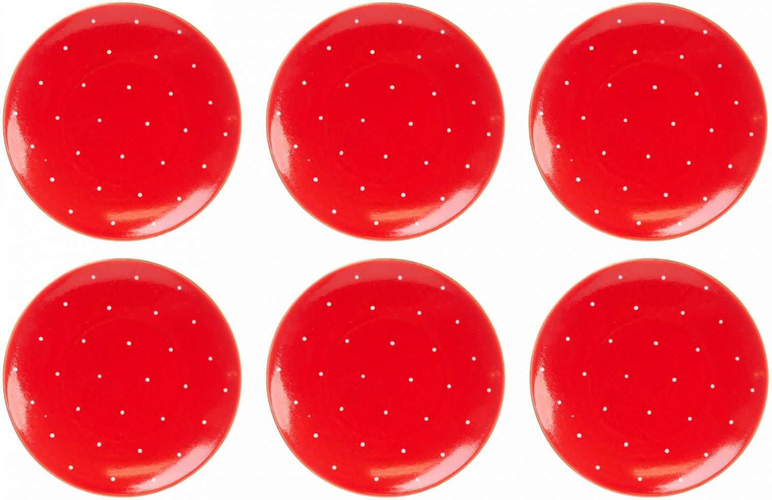 Komplet sześciu talerzy deserowych w kolorze czerwonym w białe kropki. Wykonane z użytkowej ceramiki szlachetnej. Wyprodukowane w Polsce przez fabrykę ceramiki szlachetnej w Mieroszowie. Ceramikę można myć w domowych zmywarkach. Wzór: groszki Produkt 6 x talerz deserowy Wymiary średnica: około 17,5 cm Materiał ceramika szlachetna Użytkowanie można myć w domowych zmywarka dopuszczone do kontaktu z żywnością