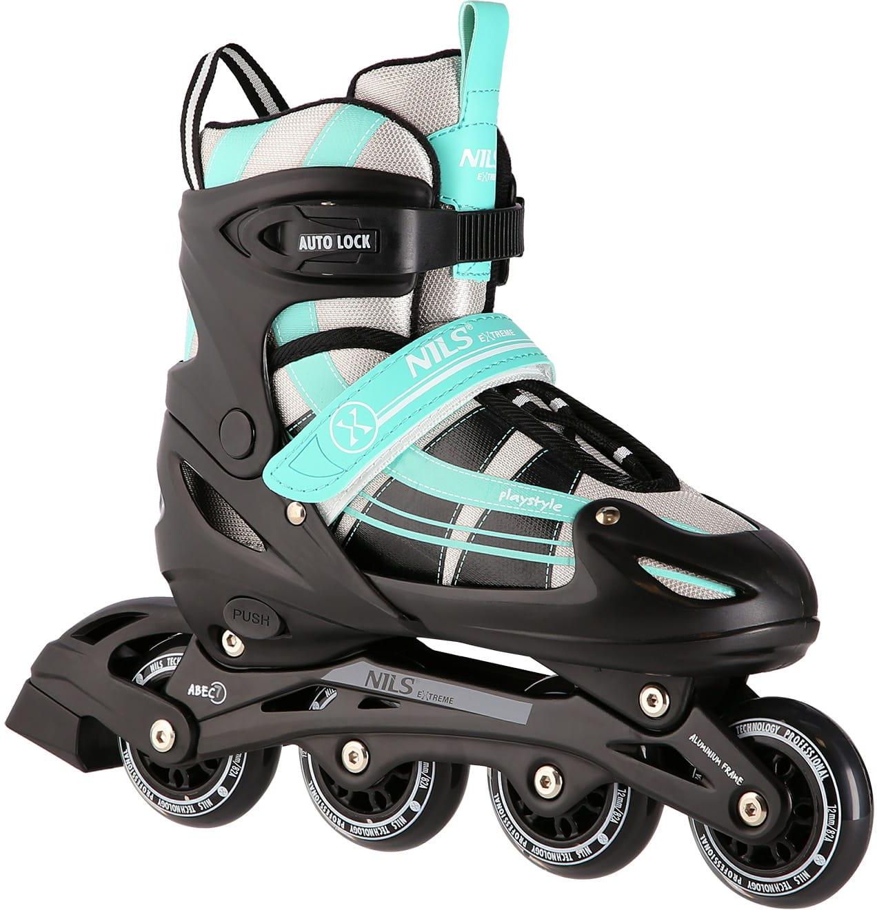 Dane techniczne Numer katalogowy: NH18366 .Rodzaj: 2w1: rolki, łyżwy Regulacja rozmiaru: Tak Kolor: Miętowy, Czarny But Rodzaj zapięcia: klamra dwusekcyjna, pasek na rzep, sznurowanie Wkładka Rodzaj wkładki: oddychająca membrana Materiał wkładki: Velvet, pianka o dużej gęstości 8mm Płoza rolki Materiał płozy rolki: Aluminium Kółka Materiał kółek: Kauczukowe - PU Rozmiar kółek: 64mm (S), 70mm (M), 72mm (L) Twardość kółek: 82 A Kolor kółek: Czarny Łożyska: ABEC-7 Płoza łyżwy Typ płozy: Hokejowa Materiał płozy: Wysokogatunkowa stal nierdzewna NH18366 Nils Extreme to łyżwy przeznaczone dla pasjonatów jazdy. Produkt oferuje 2 możliwości konfiguracji. Są to: łyżwy, łyżworolki. Dlaczego warto zdecydować się na wybór modelu NH18366 Nils Extreme? Ponieważ pozwala on w pełni korzystać z zalet, jakie niesie z sobą gra w hokeja oraz jazda na łyżworolkach. Łyżwy NH18366 Nils Extreme charakteryzują bardzo dobre właściwości jezdne. Jest to zasługą płóz wykonanych z wysokogatunkowej stali nierdzewnej oraz wielouchwytowego systemu zapięć, składającego się z paska na rzep, klamry i sznurowadeł, pewnie trzymającego stopy. Wszystko to sprawia, że model ten sprawdza się dobrze w każdych warunkach, dostarczając niepowtarzalnych wrażeń z treningu. To wygodne łyżwy hokejowe, zaprojektowane z myślą o początkujących i średniozaawansowanych użytkownikach. Ich wysoka jakość gwarantuje trwałość i odporność na uszkodzenia mechaniczne. Łyżworolki NH18366 to czysta radość z jazdy. Łyżworolka wyposażona jest w specjalną aluminiową płozę oraz hamulec co zapewnia bezpieczeństwo podczas jazdy. Z kolei kółka oraz łożyska klasy ABEC7 pozwalają na mniejsze opory toczenia, czyli szybszą jazdę. Model NH18366 Nils Extreme został również wyposażony w trzystopniową regulację rozmiaru buta, pozwalającą dostosować go do potrzeb użytkownika. Jest to sposób na oszczędność czasu oraz pieniędzy. Takie rozwiązanie pozwala bowiem na przedłużenie ich żywotności, daje też możliwość korzystania z nich więcej niż jednej osobie. Rozmiarówka: Długość Wkładki (mm) S (31-34) 180-200 M (35-38) 210-230 L (39-42) 245-270