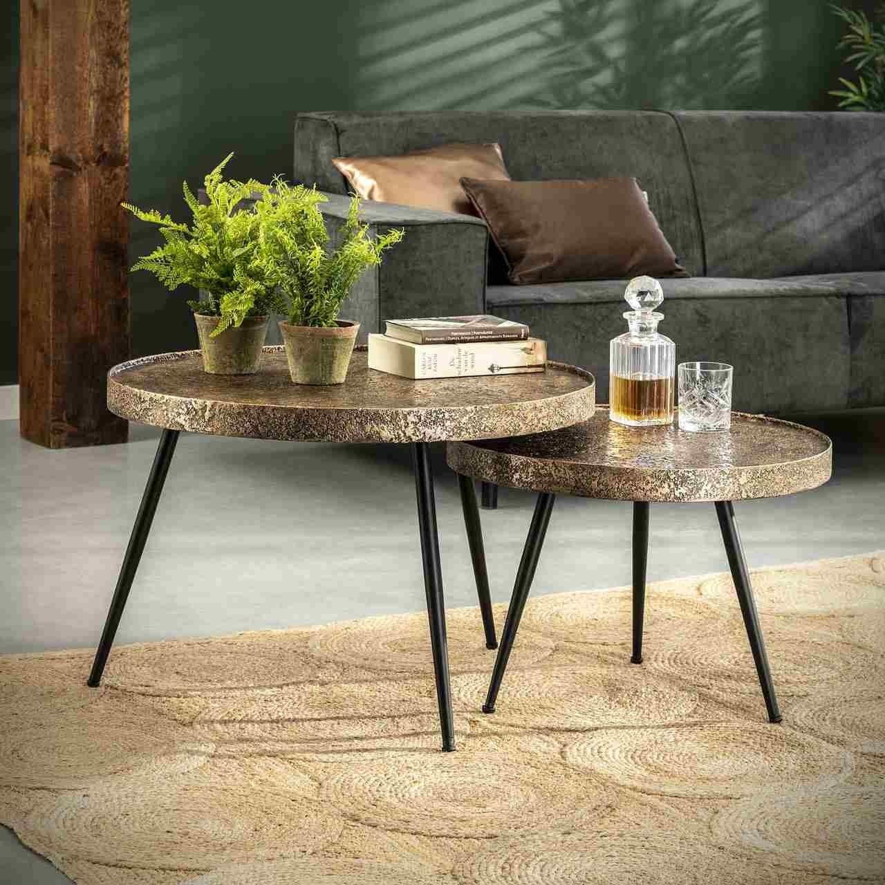 ZESTAW STOLIKÓW METALIC Ten zestaw stolików kawowych jest wykonany z metalicznego, antycznego brązu. Kolor złota i brązu w połączeniu z czarnymi nóżkami nadaje stolikom elegancki, niepowtarzalny wygląd. Stoliki kawowe idealnie sprawdzą się we wnętrzach w stylu vintage. Nlhome to meble, oświetlenie …