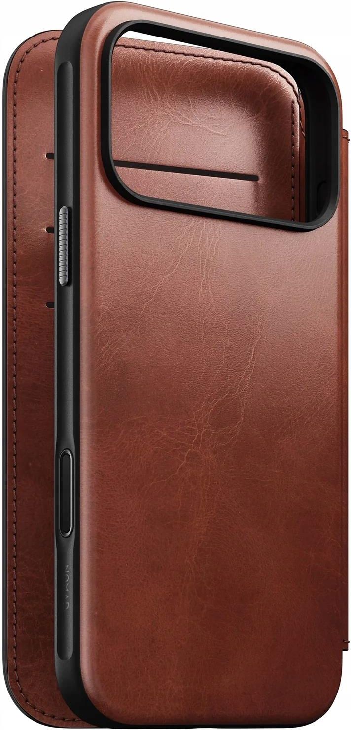 Nomad Modern Leather Folio Horween Series do MagSafe Do Apple iPhone 17 Pro Max Wersja kolorystyczna: Olde dublin (brązowa) Materiał: skóra naturalna Horween z USA Wykończenie: każda sztuka tworzona z unikalnej skóry o indywidualnej fakturze Budowa: smukła, lekka Posiada 3 miejsca na karty oraz 1 miejsce na gotówkę, zapięcie magnetyczne Wykończenie: matowe, przyjemne w dotyku, Chroni przed upadkami z wysokości do 2,4 metra. Kompatybilny z technologią MagSafe i ładowaniem bezprzewodowym Kod producenta: 856504014087 Kod produktu: 856504014087 Etui kompatybilne ze szkłami o wymiarach mniejszych niż (dług. x szer.): 16,00 x 7,45 cm Pokrowiec ze skóry z klapką Nowoczesne etui Modern Leather Folio Horween Series marki Nomad to prawdziwa perełka dla wymagających osób, które cenią doskonały styl. Autentyczna, amerykańska skóra Horween jest roślinnie garbowana. Ten case nie tylko chroni telefon przed upadkami. Jego skóra jest unikatowa i posiada indywidualne detale i odcień. Minimalistyczna obróbka to w tym przypadku największy atut, który wprowadza skórę w naturalnym stanie do świata nowoczesnych technologii. Case ochronny na upadki Pokrowiec gwarantuje ochronę przed wszelkimi wstrząsami, ale także pełne zabezpieczenie w sytuacjach, które mogą wydawać się nieprzewidywalne. Dzięki temu Twój cenny sprzęt pozostaje w pełni bezpieczny nawet podczas upadków z wysokości, aż do 2,4 metra. Cover ze schowkiem na karty i banknoty Wyposażone w trzy praktyczne miejsca na karty oraz schowek na gotówkę pomaga Ci zachować porządek wśród swoich dokumentów i pieniędzy. Ale to jeszcze nie wszystko! Case został zaprojektowany z myślą o Twoich indywidualnych potrzebach. Dzięki odpinanemu zapięciu magnetycznemu masz pełną kontrolę nad bezpieczeństwem telefonu. Obudowa do MagSafe Nie musisz już martwić się o konieczność zdejmowania etui, aby naładować telefon bezprzewodowo - dotyczy modeli telefonów wyposażonych w tę funkcję. Cover jest kompatybilny z technologią MagSafe, umożliwiając szybkie i pewne przyczepienie Twojego urządzenia do mocowania magnetycznego. Co więcej, dzięki temu możesz z łatwością korzystać z ładowarek, uchwytów i innych akcesoriów wykorzystujących tę technologię.