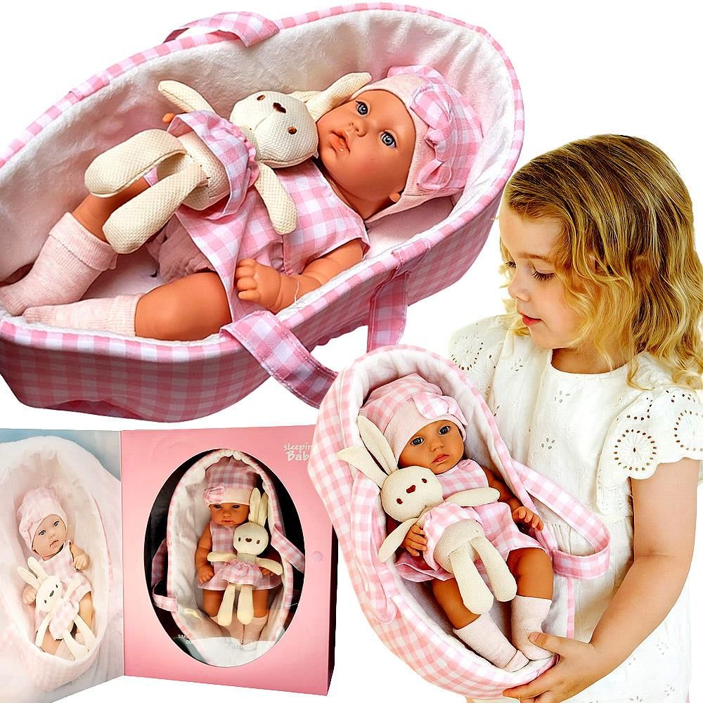 LALKA BOBAS NIEMOWLAK W SUKIENCE NOSIDEŁKU Z MASKOTKA KRÓLIK NA PREZENT Bobas lalka niemowlak noworodek z maskotką królikiem w nosidełku – różowa sukienka, czapka, prezent dla dziecka – idealny prezent Śliczna lalka bobas – noworodek w różowej sukience i czapce, z maskotką królikiem w zestawie. …
