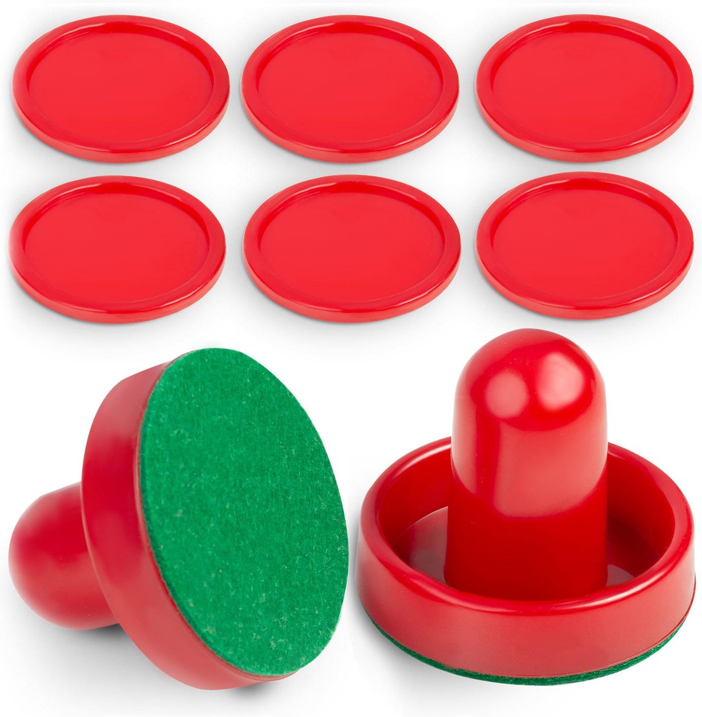 Zestaw do mini Air Hockeya - Neosport! W zestawie: krążek (6 szt.), uchwyt do gry dla każdego zawodnika (2 szt.), filc do podklejenia. Akcesoria do gry Cymbergaj Air Hockey Przenośna wersja Air Hockeya to idealny prezent dla dzieci lubiących sportową rywalizację. Szybka, dynamiczna rozgrywka ćwiczy refleks i koncentrację malucha, a dorośli też chętnie z nim zagrają. Nie musisz się martwić, gdy pogubią się ruchome części — u nas łatwo znajdziesz zarówno odbijak (grzybek, sombrero), filc do jego podklejenia, jak krążki na wymianę. Specyfikacja: waga produktu: 0.05 kg, wymiary: 4,5 x 5 cm.