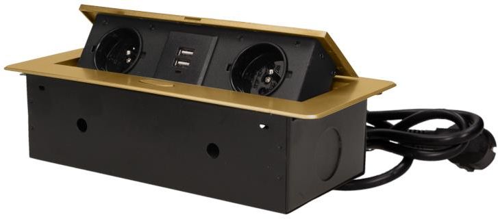 ORNO Gniazda Meblowe Wpuszczane w Blat z Płaskim Frezowanym Rantem, Ładowarką USB i Przewodem 1,5m 2x2P+Z 2xUSB Kolor Mosiądzu OR-AE-13126/BR Ten zestaw dwóch gniazd sieciowych z uziemieniem Schuko, przesłonami torów prądowych i ładowarką USB jest idealnym rozwiązaniem do montażu w biurkach, blatach i stołach. Wyposażony w płaski rant o grubości zaledwie 2 mm, obudowa z gniazdami doskonale wpasowuje się w płaszczyznę stołu, zapewniając wygodny dostęp do gniazd elektrycznych i jednocześnie nie przeszkadza w jego czyszczeniu. Główne Cechy: Model: Do Wbudowania Wysokość: 67mm Model Uchylny: Tak Standard Gniazd: Schuko (typ F) Max. Obciążenie: 3600W Liczba Gniazd ze Stykiem Ochronnym (SCHUKO): 2 Liczba Złączy USB: 2 Inne Cechy: Grubość Rantu 2 mm Kolor: Mosiądz Z Wbudowanym Zasilaczem USB: Tak Materiał: Stop Cynku + Blacha Stalowa Napięcie Wyjściowe Ładowarki USB: 5VDC/2,1A Częstotliwość: 50 Hz Stopień Ochrony (IP): IP20 Wymiary Otworu Montażowego - Długość: 112mm Wymiary Otworu Montażowego - Szerokość: 227mm Głębokość Wbudowania: 65mm Długość Przewodu Zasilającego: 1.50m Szerokość: 265mm Długość: 119mm Opis: Ten zestaw gniazd meblowych jest niezwykle praktycznym rozwiązaniem, które pozwala na wygodne korzystanie z prądu elektrycznego i ładowania urządzeń USB bez konieczności rozsiewania kabli po blacie czy biurku. Dzięki płaskiemu rantowi, gniazda są niemal niewidoczne i harmonijnie wpasowują się w płaszczyznę mebla. Zaawansowana konstrukcja gwarantuje bezpieczeństwo i niezawodność użytkowania. Dwa gniazda Schuko z uziemieniem pozwalają na podłączenie różnych urządzeń, a dwie ładowarki USB z wbudowanym zasilaczem dostarczają energii do smartfonów, tabletów i innych urządzeń. Jeśli potrzebujesz eleganckiego i funkcjonalnego rozwiązania do zasilania i ładowania w biurku, blacie lub stole, ORNO Gniazda Meblowe Wpuszczane w Blat z Płaskim Frezowanym Rantem, Ładowarką USB i Przewodem 1,5m to doskonały wybór, który poprawi organizację kabli i zapewni wygodne korzystanie z elektryczności.