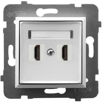 Gniazdo HDMI podwójne z serii Ospel Aria w kolorze białym. Dzięki gniazdu estetycznie wyprowadzisz 2 kable HDMI i podłączysz do niego oddalone urządzenia. Świetnie sprawdzi się w miejscach, w których potrzebujesz od czasu do czasu podłączyć np. laptop do projektora lub monitora. Produkty wchodzące w skład zestawu dostarczane są oddzielnie.