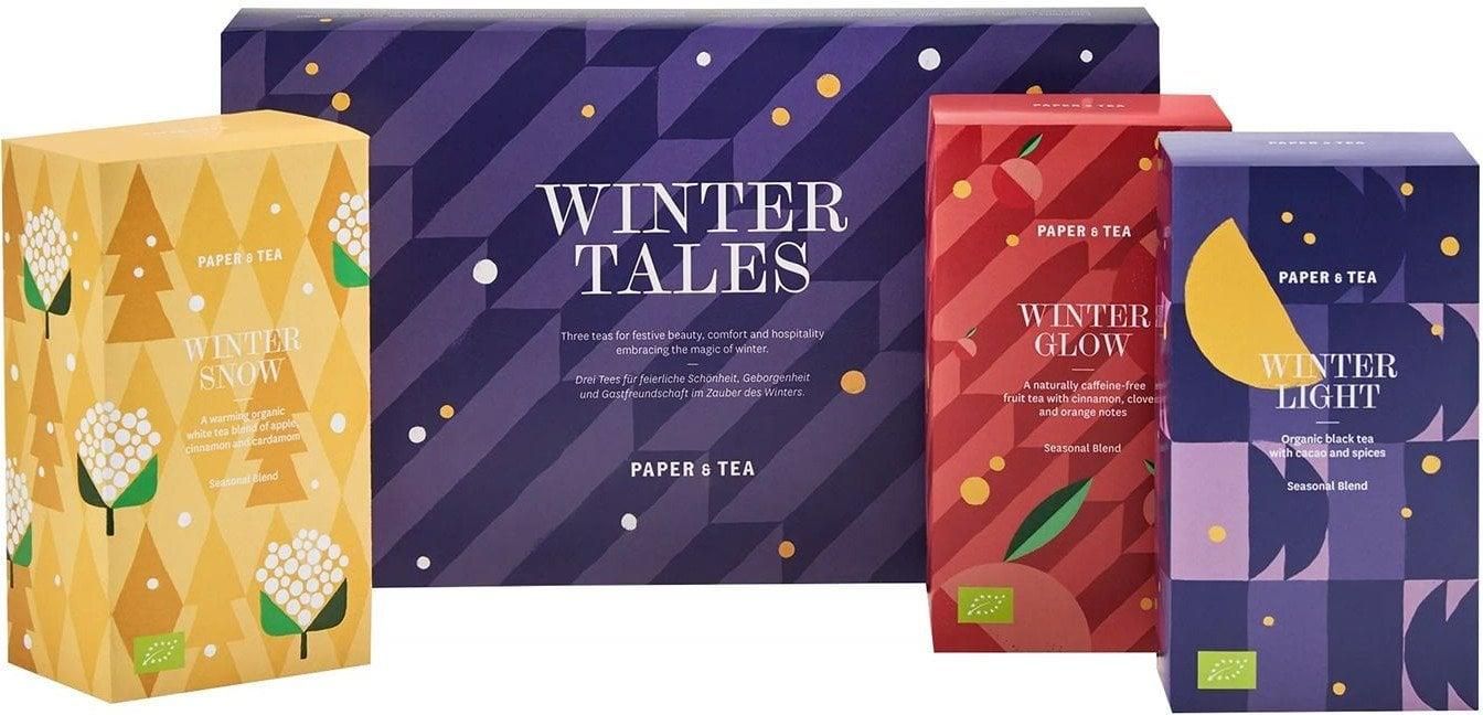 Paper & Tea Winter Tales to zestaw trzech zimowych herbat sypanych: Winter Glow 100g, Winter Snow 70g oraz Winter Light 100g. Paper & Tea Winter Glow - Herbata sypana 100g: Wyobraź sobie spacer po zaśnieżonych ulicach, migoczące w oknach światełka i zapach cynamonu unoszący się w powietrzu. Ta naturalnie bezkofeinowa, organiczna mieszanka owocowa, stworzona z soczystych owoców czarnego bzu, płatków róż, hibiskusa i Twoich ulubionych świątecznych przypraw, zabierze Cię w aromatyczną podróż po świątecznym jarmarku. Składniki: owoce czarnego bzu*, hibiskus*, imbir*, skórka pomarańczy* (4%), burak*, cynamon* (2%), płatki róż*, czarna porzeczka*, truskawki*, goździki* (1%), kardamon*, naturalny aromat rumowy, olejek z kory cynamonowej*, naturalny aromat goździkowy, naturalny aromat kardamonowy (*certyfikowany ekologiczny). Paper & Tea Winter Snow - Herbata sypana 70g: Zamknij oczy, poczuj spokój zimowej scenerii i delektuj się każdą kroplą do pełna. Do tej zimowej herbacianej kompozycji połączyliśmy delikatną białą herbatę z cynamonem, kardamonem i jabłkiem. Składniki: kawałki jabłka* (44%), biała herbata* (35%), cynamon* (10%), dzikie jabłko* (10%), owoce kardamonu* (1%), olejek z kory cynamonowej*, naturalny aromat kardamonowy (*certyfikowany ekologiczny). Paper & Tea Winter Light - Herbata sypana 100g: Mieszanka czarnej herbaty, która zachwyca jak świeżo upieczone świąteczne ciasteczka. Zimowe przyprawy podkreślają słodkie i słodowe nuty czarnej herbaty, a prawdziwe ziarna kakao dodają ostatecznego szlifu, inspirowanego naszymi ulubionymi przepisami na ciasteczka. Składniki: czarna herbata* (34%), ziarna kakao* (26%), łuska kakaowa* (10%), kardamon*, goździki*, cynamon*, różowy pieprz*, kwiaty krokosza*, anyż* (*certyfikowany ekologiczny).