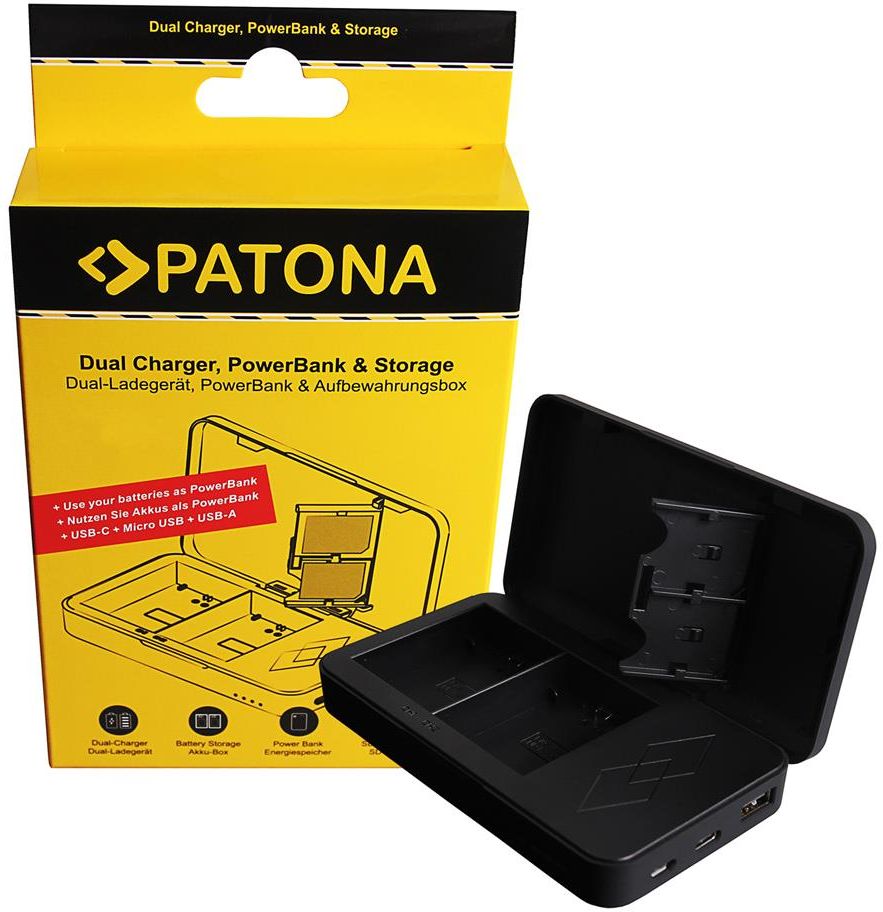 PATONA 9892 Ładowarka/Power bank do akumulatorów Sony FZ-100 Podwójna ładowarka do akumulatorów typu Sony NP.-FZ100 z funkcją power banku i miejscem na karty pamięci.Dzięki nowej podwójnej ładowarce PATONA do Sony NP.-FZ100 masz wszystko w jednym pudełku. Przechowuj i ładuj do dwóch akumulatorów jednocześnie. Naładowane baterie mogą być używane jako power bank. Nowoczesny mikrokontroler steruje elektroniką. Ładowarkę można podłączyć do źródła zasilania za pomocą portu USB-C lub micro-USB. Wyświetlacz kontrolny informuje o aktualnym sposobie wykorzystania (jako ładowarka lub power bank) akumulatorów. Instrukcje użytkowania: Ładowarka: Podłącz urządzenie do źródła zasilania. Diody LED migają na czerwono/zielono/niebiesko. Teraz włóż baterie do podstawek ładujących. Gdy tylko dioda LED zaświeci się na zielono, proces ładowania jest zakończony. Power bank: Gdy baterie są naładowane, możesz używać urządzenia jako power banku za pomocą kabla USB-A. W tym celu podłącz wyjście USB-A do kompatybilnego urządzenia, takiego jak smartfon, tablet, aparat, gimbal itp. Podczas rozładowania dioda LED świeci na niebiesko. Specyfikacja techniczna: Wejście - USB-C / Micro-USB, 5V, 2.1A (min) Wyjście - 2 x 8,4 V / 1000 mAh * 1, 500 mAh * 2 Waga - 136g Wymiary - 7,3 x 13 x 2,9 cm (szer. x dł. x gł.) W zestawie - ładowarka, instrukcja Nadaje się do następujących typów kamer: Sony A7 III, A7 3, A7M3, Alpha A7 III, Alpha A7 3, Alpha 7 III, Alpha 7 3, Alpha 7M3 Sony A7 R III, A7 R 3, A7RM3, Alpha A7 R III, Alpha A7 R 3, Alpha 7 R III, Alpha 7 R 3, Alpha 7RM3, A7RIV Sony A9, Alpha 9, Alpha 9II Sony BC-QZ1