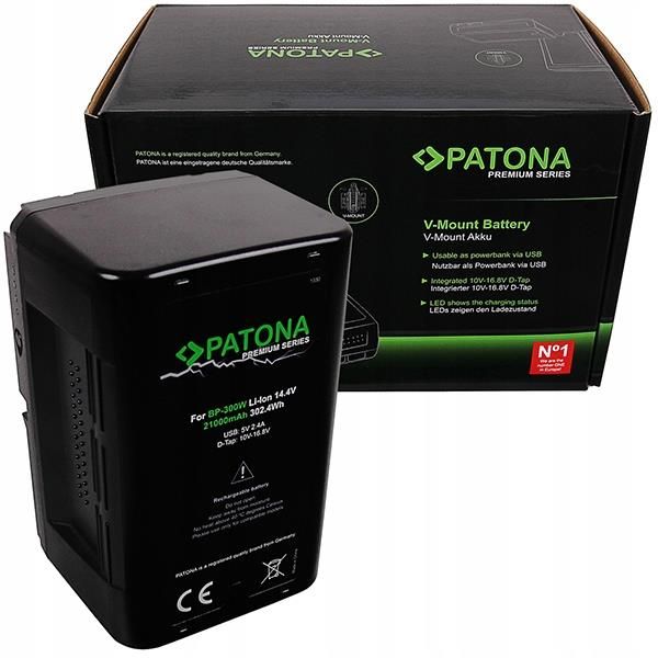 PATONA Premium Akumulator V-Mount 302Wh do Sony BP300W DSR 250P 600P 650P 652P Dane techniczne Pojemność: 21000mAh Napięcie: 14,4V Energia: 302,4Wh Typ ogniw: Li-Ion Złącze: V-Mount Port USB: 5,0V / 2,1A Wyjście D-Tap: 10V–16,8V Maksymalny prąd wyjściowy: 10A Waga: 1576g Wymiary: 98 x 148 x 78mm Seria: PATONA Premium Kompatybilne modele baterii Sony: BP95W, BP-95WS, BPGL65, BP-GL65, BPGL95, BP-GL95, BP150w, BP-150w, BP-190S, BP-190WS, BP-C190S, BP-230W, BP230W, BP-300W, BP300W Kompatybilne modele urządzeń Sony DSR-250P, DSR-600P, DSR-650P, DSR-652P HDW-800P PDW-850 Oraz wszystkie urządzenia obsługujące baterie V-Mount PATONA Premium V-Mount 302Wh to bateria o wyjątkowo dużej pojemności, zaprojektowana z myślą o profesjonalistach pracujących z kamerami Sony oraz urządzeniami ze złączem V-Mount. Dzięki pojemności 21000mAh oraz nowoczesnym ogniwom litowo-jonowym, bateria gwarantuje długi czas pracy nawet przy intensywnym użytkowaniu. Dodatkowe złącza USB oraz D-Tap umożliwiają zasilanie innych urządzeń – idealne rozwiązanie na planach filmowych, w studio i w terenie. System PATONA V-Mount, składający się z akumulatorów V-Mount i ładowarek V-Mount, jest niezwykle wszechstronny. Jeśli chcesz się swobodnie przemieszczać, a bezpośrednie zasilanie z gniazdka nie jest dostępne, możesz polegać na systemie V-Mount. Firma PATONA to specjalista od wysokiej jakości akcesoriów V-Mount. W przeszłości systemy V-Mount były bardzo drogie i można je było znaleźć tylko w najwyższym segmencie cenowym. Patona Premium V-Mount BP300W to sprzęt idealnie skrojony dla filmowców i profesjonalnych fotografów. System V-Mount oferuje także inne, niezwykle przydatne funkcje jak gniazda D-Tap, Powerbank o pojemności aż 21000 mAh. Dla dodatkowej wygody bateria ma zainstalowane wyjście USB i dlatego może być używana do ładowania innego urządzenia przez USB. Akumulatory z serii Premium zostały wyposażone w nowoczesne, markowe ogniwa litowo-jonowe (LG, Panasonic, Sanyo i inne). Zalety tego systemu doceni także amatorski fotograf, który zyska solidny i ekskluzywny produkt za niewygórowaną cenę. Seria Premium gwarantuje większą wytrzymałość i wydajność niż standardowe ogniwa. Jeśli szukasz produktu najwyższej jakości, zalecamy zakup serii PATONA Premium. Akumulator litowo-jonowy ma niski poziom samorozładowania, nawet gdy nie jest używany. Ta niewielka strata energii jest opłacalna na trzy sposoby: akumulator można szybko ponownie wykorzystać, nawet jeśli nie był używany przez dłuższy czas nie trzeba go niepotrzebnie często ładować, co ma efektywny wpływ na żywotność baterii środowisko jest chronione dzięki minimalnym stratom energii, którą oszczędzają Bateria jest w 100% kompatybilna z oryginalnymi bateriami Sony BP65/95 dzięki indywidualnemu dopasowaniu, w tym ochronie przed przeładowaniem i przegrzaniem. Do ładowania akumulatora można użyć popularnych ładowarek lub dwu i czterokanałowych Patona z mocowaniem typu V-Mount.