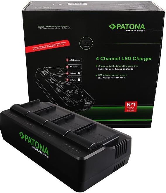 PATONA Premium 4-kanałowa Ładowarka do Canona BP-A30 BP-A60 BP-A65 BP-A90 EOS C200 C200B C300 Mark II XF705 Mamy przyjemność zaprezentować Państwu kolejny produkt z naszej oferty produktów premium. Dzięki naszej 4-kanałowej ładowarce możesz ładować jednocześnie do czterech akumulatorów litowo-jonowych 8,4 V / 16,8 V. Inteligentna jednostka sterująca (MCU) reguluje dystrybucję napięcia na 4 kanały. Ładowarka PATONA Premium 4-kanałowa posiada zintegrowaną ochronę przeciwprzepięciową. Kubki ładujące PATONA Premium zostały opracowane specjalnie dla tego urządzenia i ze względów bezpieczeństwa są przystosowane do większych obciążeń. Można je rozpoznać po czerwonym podwoziu. Dane techniczne Wejście: AC 100 V-240 V 50/60 Hz Wyjście: 8,4 V x4 (8,3–8,5 V) / 16,4 V x4 (16,3–16,5 V) Wyjście: 2000 mA x4 ± 200 mA (CV 7,2 V) / 1000 mA x4 ± 100 mA (CV 14,4 V) funkcja szybkiego ładowania Dioda LED stanu dla każdego kanału waga: 0,6 kg Wymiary: 22 x 12,5 x 6 cm (dł. x gł. x wys.) Zakres dostawy: 1x 4-krotna ładowarka | 1x przewód zasilający UE + 1x Wielka Brytania | 1x podręcznik niemiecki/angielski/hiszpański/francuski/francuski/włoski/czeski Zgodny numer części: Kanon CA-CP200L, EOS C200, C200 PL, C200B, C300 Mark II, C300 Mark II PL, XF705 Uwaga: ta ładowarka może nie być oferowana w sprzedaży w serwisie eBay i Amazon.