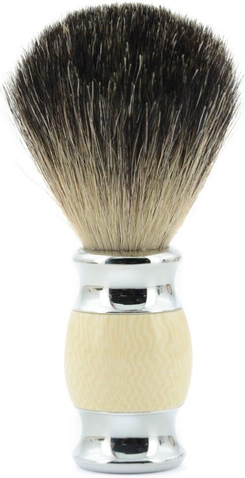 Pędzel Do Golenia Z Włosiem Borsuka 100% Pędzel wykonany został z najwyższej jakości ciemnego cieniowanego włosa borsuka klasy Premium. Dzięki starannemu wyselekcjonowaniu włosów, pędzel ten jest w czołówce. Włosy pędzla zostały specjalnie zmiękczone dzięki czemu są przyjemniejsze dla skóry. Pędzel posiada bardzo gęste włosie, które idealnie rozprowadza mydło czy piankę po twarzy. Rączka pędzla została wykonana z wysokiej jakości materiału wyprofilowanego w sposób który zapewnia płynność ruchu. Zapakowany w ładne pudełko, idealny na prezent.