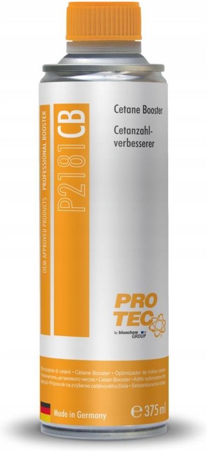 PROTEC CETANE BOOSTER 375ML To ulepszacz cetanowy, który zwiększa liczbę cetanową oleju napędowego nawet do 5 punktów. Produkt jest idealny dla olejów napędowych niższej jakości. Zmniejsza „stukanie silnika”, zapewnia równomierne spalanie, usuwa sadzę oraz zanieczyszczenia . Ponadto zapobiega przegrzaniu spowodowanemu niską liczbą cetanową oleju napędowego. 375ML na 80L oleju napędowego.