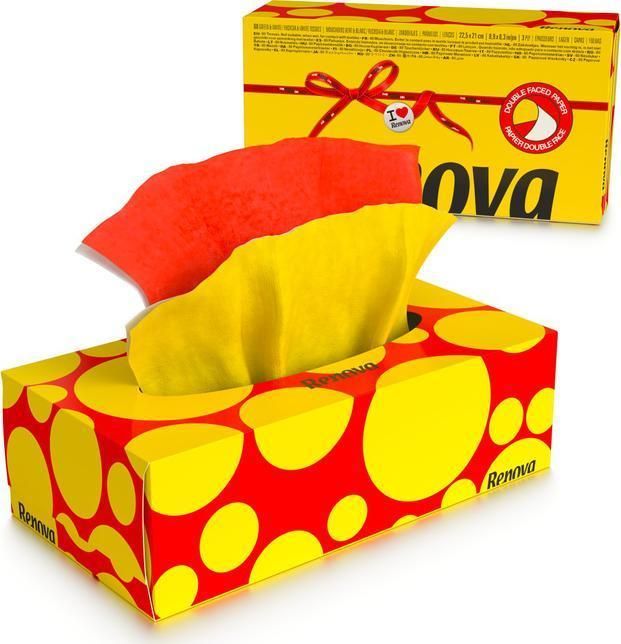 Chusteczki higieniczne Renova czerwono-żółte 80 szt Wyjątkowo miękkie, dwukolorowe chusteczki higieniczne 3-warstwowe w dwóch kolorach: czerwona warstwa z miękką białą warstwą od spodu / żółta i miękka biała warstwa od spodu.. W efektownym pudełku, gotowe do podbicia najlepszego miejsca w domu lub …
