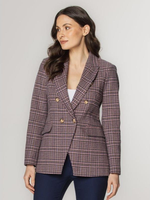 Różowa, dwurzędowa marynarka damska w granatową i brązową kratkę ze złotymi guzikami