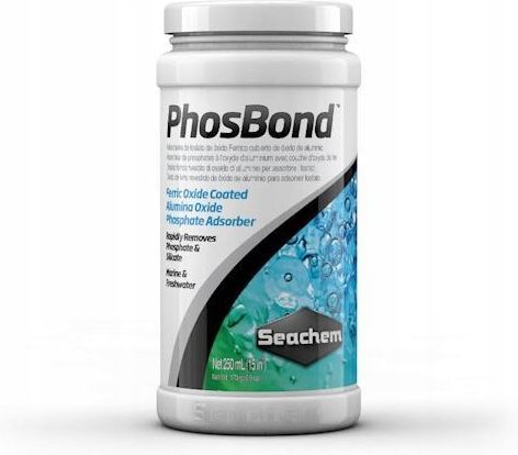 Szybko usuwa fosforany i krzemiany z wody słonej i słodkiej. Łączy w sobie zalety różnych typów środków usuwających fosforany. PhosBond to rewolucyjny nowy produkt, który łączy w sobie możliwości usuwania fosforanów za pomocą tlenku glinu i granulowanego tlenku żelaza połączonych w jednym materiale tworzącym efekt synergiczny. Szybko usuwa fosforany i krzemiany z wody słonej i słodkiej. Łączy w sobie zalety różnych typów środków usuwających fosforany. Dzięki wysokiej porowatości i dużemu polu powierzchni, daje bardzo dużą zdolność wiązania, a jego wytrzymałość i integralność fizyczna zapewnia, że nie rozkłada się od naprężeń mechanicznych. Zalecenia: Dla uzyskania najlepszych efektów, PhosBond powinien zostać przepłukany przed użyciem, oraz umieszczony w akwarium w miejscu o największym przepływie wody, ale nie w miejscu bezpośredniego wpompowania wody do filtra. Może być używany w filtrach kanistrowych, kaskadowych, we wszystkich filtrach zewnętrznych, oraz w każdym filtrze o dużym przepływie wody. Zaleca się użycie go w woreczkach filtracyjnych, lub luzem w filtrach fluidyzacyjnych. Sposób użycia: Użyj 60ml (¼ nakrętki) na każde 300 L słonej wody, lub na 400 L słodkiej wody. Zostaw produkt w akwarium przez 4 dni, po czym sprawdź poziom fosforanów i krzemianów za pomocą testów MultiTest Phosphate lub MultiTest Silicate. Jeżeli poziom związku chemicznego, którego zawartość chcesz zmniejszyć nie zmalał do 0.02 mg/L to przełóż PhosBond w inne miejsce w akwarium. Jeżeli poziom związków chemicznych spadł do oczekiwanego, pozostaw PhosBond do momentu ponownego wzrostu zawartości związków. Tak długo jak poziom związków jest pod kontrolą PhosBond nie jest wyczerpany. Zbyt długie używanie nie jest zalecane. PhosBond nie uwalnia żadnych szkodliwych substancji do wody. Nie wywołuje ługowania fosforanów lub krzemianów z powrotem do wody i może być usunięty, wysuszony i ponownie użyty, jeśli nie został wcześniej wyczerpany. Ciągłe używanie małych ilości jest lepsze niż stosowanie dużej dawki raz na jakiś czas. Pojemność: 500ml Inne dostępne pojemności: 100ml, 250ml, 1 litr.