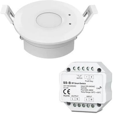 Zestaw bezprzewodowego czujnika ruchu LED Skydance, to gotowy asortyment, składający się z sufitowego czujnika mikrofalowego EH-M oraz włącznika oświetlenia LED 230V SS-B, który umożliwia podłączenie dowolnego urządzenia elektrycznego przeznaczonego na napięcie 230V (np. lampa LED 230V). Sumaryczna moc podłączonego urządzenia elektrycznego nie może przekraczać 360W. Zestaw ten, umożliwia wykrycie ruchu w technologii mikrofalowej i przekazanie sygnału zdalnie do bezprzewodowego wyłącznika LED SS-B. Komunikacja z odbiornikiem jest w pełni bezprzewodowa, ponieważ wykorzystuje sygnał radiowy na poziomie 2,4GHz. Montaż czujnika ruchu obywa się wpustowo, natomiast bezprzewodowy włącznik SS-B należy zamontować w puszce fi60.