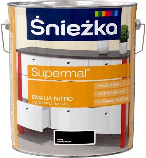 Kolor: N505 czarny | Pojemność: 10l | Efekt wykończenia: połysk ZASTOSOWANIE Drewno Metal Meble wewnątrz pomieszczeń DOSTĘPNE KOLORY biały czarny szary jasny brązowy czerwony srebrny khaki zielony żółty jasny niebieski OPIS PRODUKTU Śnieżka SUPERMAL Emalia Nitro  jest przeznaczona do profesjonalnego wykorzystania. Służy do malowania galanterii, która wykonana jest z drewna, a także z materiałów drewnopochodnych i metalu. Prócz malowania galanterii można z niej również korzystać przy przemysłowym malowaniu elementów metalowych, drewnianych czy drewnopochodnych. Należy mieć na uwadze, że wymalowanie nie jest odporne na działanie zmiennych warunków atmosferycznych. Wydajność: do 10 m²/l przy jednokrotnym malowaniu Ilość warstw: 2 Metoda aplikacji:  pędzel, natrysk WŁAŚCIWOŚCI szybkie schnięcie odporność na ścieranie wysoki połysk STOSOWANIE KROK PO KROKU I KROK - Przygotowanie podłoża powierzchnie przeznaczone do malowania  powinny być suche, bez kurzu i zanieczyszczeń drewno zażywiczone lub zatłuszczone przemyć rozpuszczalnikiem nitro albo benzyną ekstrakcyjną tak przygotowane nowe podłoże zagruntować  Podkładem Nitro Vidaron podłoże metalowe oczyścić z rdzy i innych zanieczyszczeń, odtłuścić i zagruntować farbą  antykorozyjną Śnieżka Urekor S podłoża przeznaczone do renowacji oczyścić, usunąć luźno związane warstwy starych emalii, odpylić KROK II - Przygotowanie wyrobu emalię przed użyciem należy  dokładnie wymieszać w razie potrzeby wyrób rozcieńczyć rozcieńczalnikiem do wyrobów nitro do lepkości roboczej KROK III - Malowanie malować pędzlem lub przez natrysk pneumatyczny następną warstwę nakładać po wyschnięciu poprzedniej prace malarskie prowadzić w temperaturze otoczenia powyżej +10°C i wilgotności powietrza poniżej 80% O MARCE Fabryka Farb i Lakierów Śnieżka SA to firma z ponad 35-letnim doświadczeniem na rynku chemii budowlanej i wiodąca spółka w Grupie Kapitałowej Śnieżka. Firma jest jednym z liderów na rynku farb dekoracyjnych, lakierów oraz szpachli w Polsce, na Węgrzech, Ukrainie i Białorusi. Jej kluczowe marki to: Śnieżka, Magnat, Vidaron, Foveo Tech, Beston i Rafil, a także popularne na węgierskim rynku: Platinum, Inntaler, Cellkolor i Boróka.