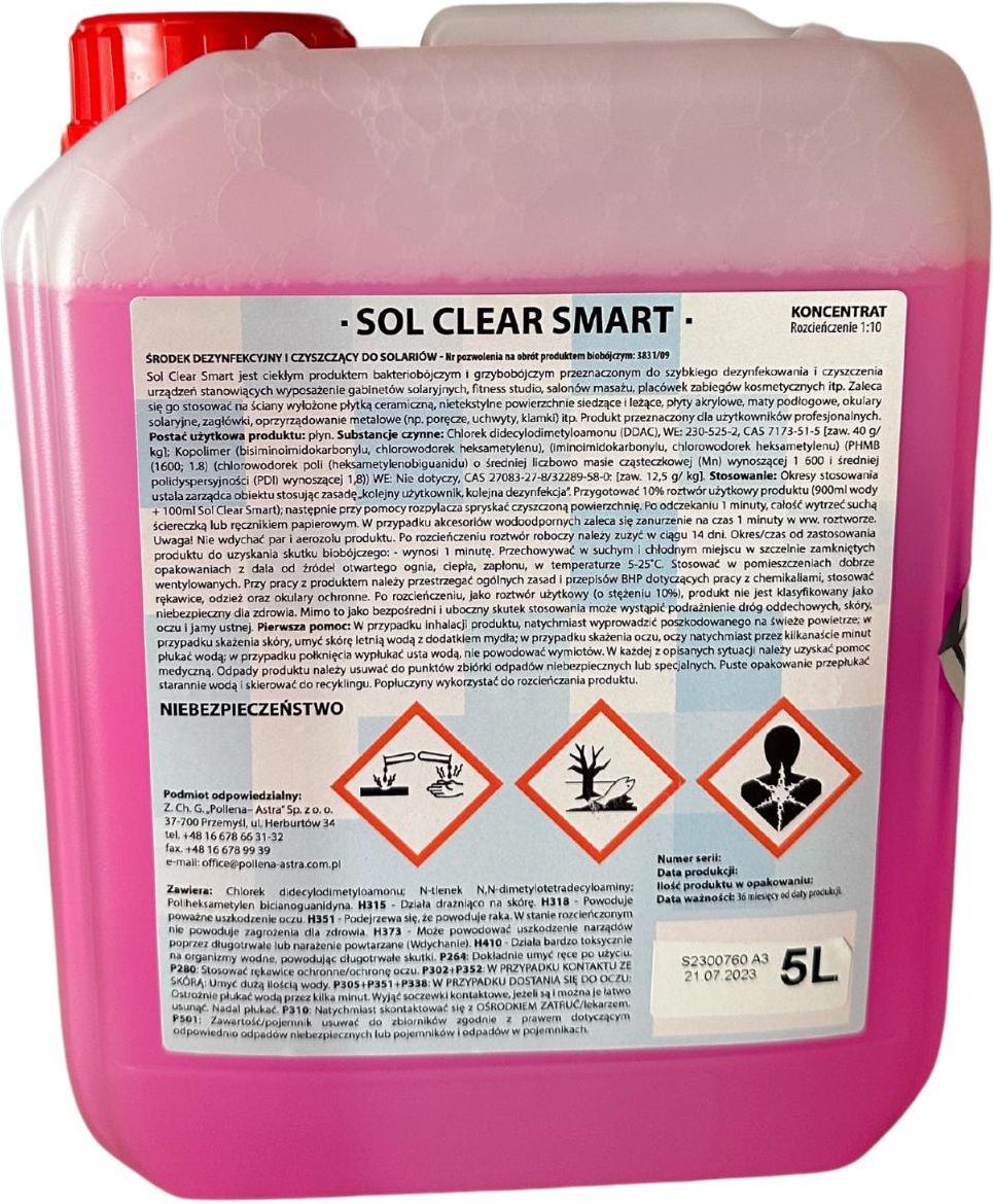 Sol Clear SMART 5l Koncentrant płynu do dezynfekcjiKoncentrat do dezynfekcji Sol Clear SmartProdukt przeznaczony do czyszczenia i dezynfekcji solarium, do płyt akrylowych oraz wszelkich powierzchni ceramicznych i sztucznych w salonach solaryjnych, studiach fitness i innych.Płyn SMART jest profesjonalnym środkiem biobójczym posiadającym pozwolenie Ministra Zdrowia na obrót. Produkt przeznaczony do zastosowań profesjonalnych.Wydajny koncentrat 1:10Doskonałe właściwości czyszcząceAntybakteryjnyBardzo przyjemny zapachNie drażni dróg oddechowychPodziałka ułatwiająca rozcieńczanie płynuOkres od zastosowania do uzyskania efektu biobójczego wynosi 60 sekund.Na życzenie do zakupionego płynu przesyłamy na maila kartę charakterystyki.Pojemność: 5L