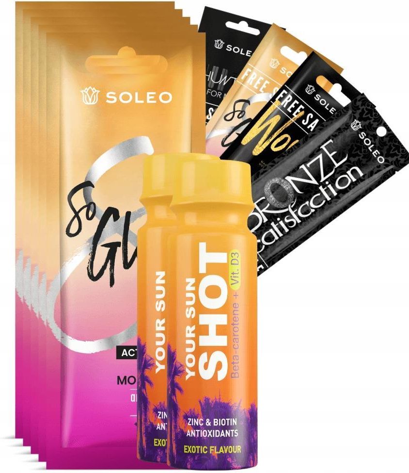 Soleo So Glam 5x15ml Przyspieszacz Opalania + GratisyAroma TrendZESTAW ZAWIERA:3x saszetka 15ml So Glam Przyspieszacz opalania Soleo2x Your Sun Shot 80ml4x mix próbek SoleoSO GLAM PRZYSPIESZACZ OPALANIASkóra wygląda świetnie, jest młoda i gładka tak jak lubisz!So Glam to balsam przyspieszający opalanie do codziennej pielęgnacji.Specjalna formuła anti-aging zapewnia efekt GLAMOUR pięknie opalonej skóry oraz długotrwałego nawilżenia.Zapach: cotton flowerPrzyspieszacz Soleo So Glam rekomendowany dla: osób o jasnej karnacji i dla tych, którzy opalają się nieregularnieSposób użycia:Bezpośrednio przed opalaniem nanieś równomierną warstwę na całą powierzchnię ciała. Po aplikacji, umyj dokładnie ręce! Pamiętaj, że produkt przeznaczony jest wyłącznie do użytku zewnętrznego. Aby skutecznie wzmacniać i zachować na opaleniznę dłużej używaj każdorazowo przed wizytą w solarium.Składniki aktywne:tyrozyna, miedź, aloes, kolagen, witamina E, ekstrakt z zielonej herbatYOUR SUN SHOTKarotenowy multidrink z wit.D wzmacniający efekt opalaniaSpragnieni słońca? Weź łyk Your Sun Shot, poczuj smak wakacji i ciesz się zachwycającą opalenizną przez cały rok. Zmotywuj skórę do działania!Your Sun Shot w formie ekspresowego drinka wspiera kondycję skóry oraz uzyskanie olśniewającej opalenizny podczas sesji opalania. Stymuluje tworzenie się brązowego pigmentu w skórze, odmładza i rozświetla oraz chroni cerę przed wolnymi rodnikami.Zatroszcz się o zdrowy wygląd i dobrą kondycję skóry od środka. Starannie dobrana kompozycja składników aktywnych Your Sun Shot skutecznie wpływa na efektywność opalania oraz utrzymanie organizmu w prawidłowej formie. Tworzenie się melaniny w skórze będzie przebiegać szybciej, a uzyskany kolor opalenizny będzie miał głębszy odcień i ładniejszy look!Najlepsze efekty uzyskasz łącząc drink Your Sun Shot z ulubionym kosmetykiem do opalania. Wypij porcję Your Sun Shot przed sesją w solarium lub w trakcie kąpieli słonecznej, a następnie nałóż wybrany kosmetyk.Tropikalne nuty poczujesz dzięki unikatowemu połączeniu smaku egzotycznych owoców w tym 20% soku z pomarańczy. Orzeźwiający smak, energia na cały dzień!Beta karoten - Wspomaga proces opalania, nadaje skórze promienny kolorytWitamina D - Wspiera odporność i wzmacnia układ kostnyWitamina E - Odżywia i uelastycznia skórę oraz chroni przed wolnymi rodnikamiEkstrakt z aceroli - Naturalne źródło witaminy C, skuteczny antyoksydant, wzmacnia odpornośćBiotyna - Zdrowa skóra, włosy i paznokcieSelen - Działa przeciwzapalnie, przyspiesza regenerację komórkową oraz chroni przed wolnymi rodnikamiBez sztucznych barwnikówBez syropu glukozo-fruktozowegoBez sztucznych aromatówProdukt wegański, bez glutenuPRÓBKI MARKI SOLEO 4x5ml Losowo wybrany MIX próbek produktów do opalania w solarium