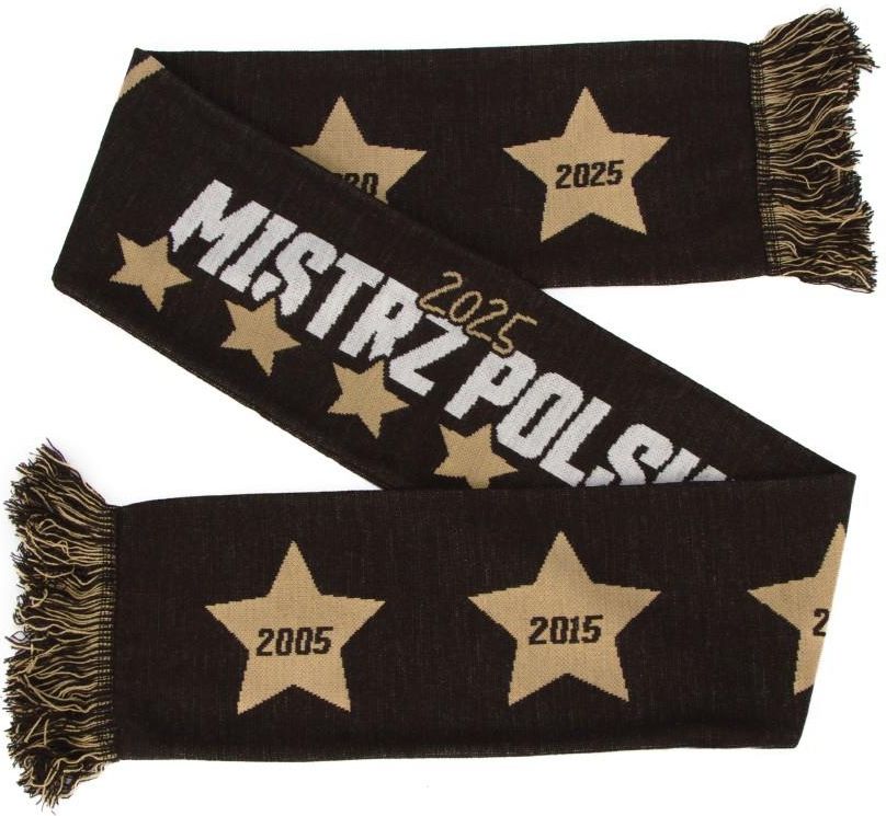 Szalik GKS Tychy Mistrz Polski 2025 Triumf, duma i klubowa tradycja Szalik GKS Tychy Mistrz Polski 2025 to wyjątkowy gadżet dla każdego kibica. Kibica który chce uczcić najnowszy tytuł mistrzowski swojego zespołu. Elegancki design, złoto-czarna kolorystyka i mistrzowskie detale sprawiają, że to idealny dodatek na trybuny, do codziennego noszenia lub jako element kolekcjonerski. Główne cechy: Ekskluzywny design mistrzowski: Na jednej stronie widnieje napis „MISTRZ POLSKI 2025” otoczony gwiazdkami symbolizującymi zdobyte tytuły. Druga strona prezentuje pełne zestawienie lat mistrzostw z centralnie umieszczonym herbem GKS Tychy. Barwy zwycięstwa: Stonowana, czarna tkanina ze złotymi akcentami i frędzlami w barwach klubu tworzy elegancki i nowoczesny wygląd. Wysoka jakość wykonania: Szalik wykonany z miękkiego, przyjemnego w dotyku materiału, który zapewnia komfort noszenia zarówno zimą, jak i na hali. Idealny dla fanów i kolekcjonerów: To nie tylko element kibicowskiego stroju, ale także pamiątka po wielkim sukcesie drużyny z sezonu 2024/2025. Szalik GKS Tychy Mistrz Polski 2025 to obowiązkowy gadżet dla każdego fana Trójkolorowych, który chce z dumą pokazać swoje wsparcie!