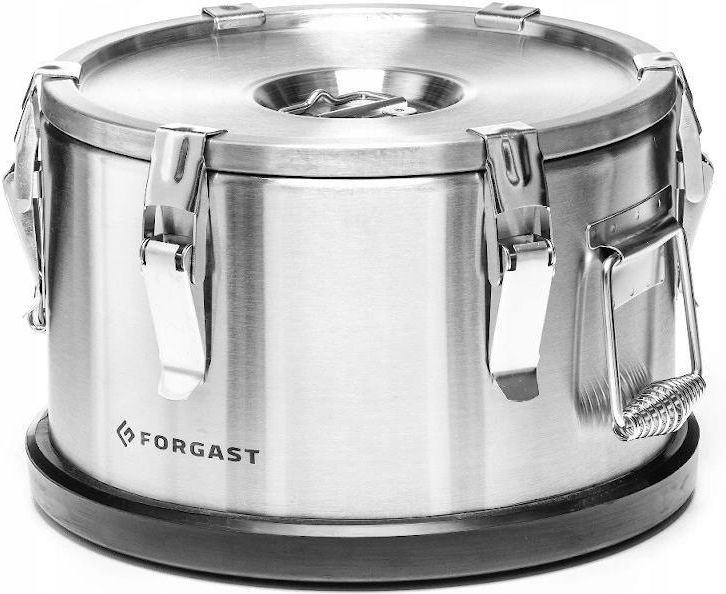 Termos do transportu żywności marki Forgast o pojemności 10 l. Wykonany ze stali nierdzewnej. Wnętrze - ze stali polerowanej. Bardzo dobra izolacja termiczna dzięki przestrzeni między ściankami wypełnionej specjalnym tworzywem izolującym oraz szczelnej pokrywie. Termos zapewnia 6 do 8 godzin utrzymania gorącej temperatury potraw. Pokrywa zamknięta na 6 mocnych zatrzasków. Silikonowa uszczelka w pokrywie dodatkowo uszczelnia termos, zabezpieczając go przed przeciekaniem. Wentyl odpowietrzający w pokrywie umożliwia otwarcie termosu z gorącą żywnością. Ergonomiczne uchwyty transportowe do łatwego przenoszenia. Guma pod dnem termosu zwiększa jego izolacyjność i zabezpiecza go przed uszkodzeniami mechanicznymi. Dodatkowo zwiększa przyczepność termosu do podłoża, uniemożliwiając jego niekontrolowane przesuwanie.