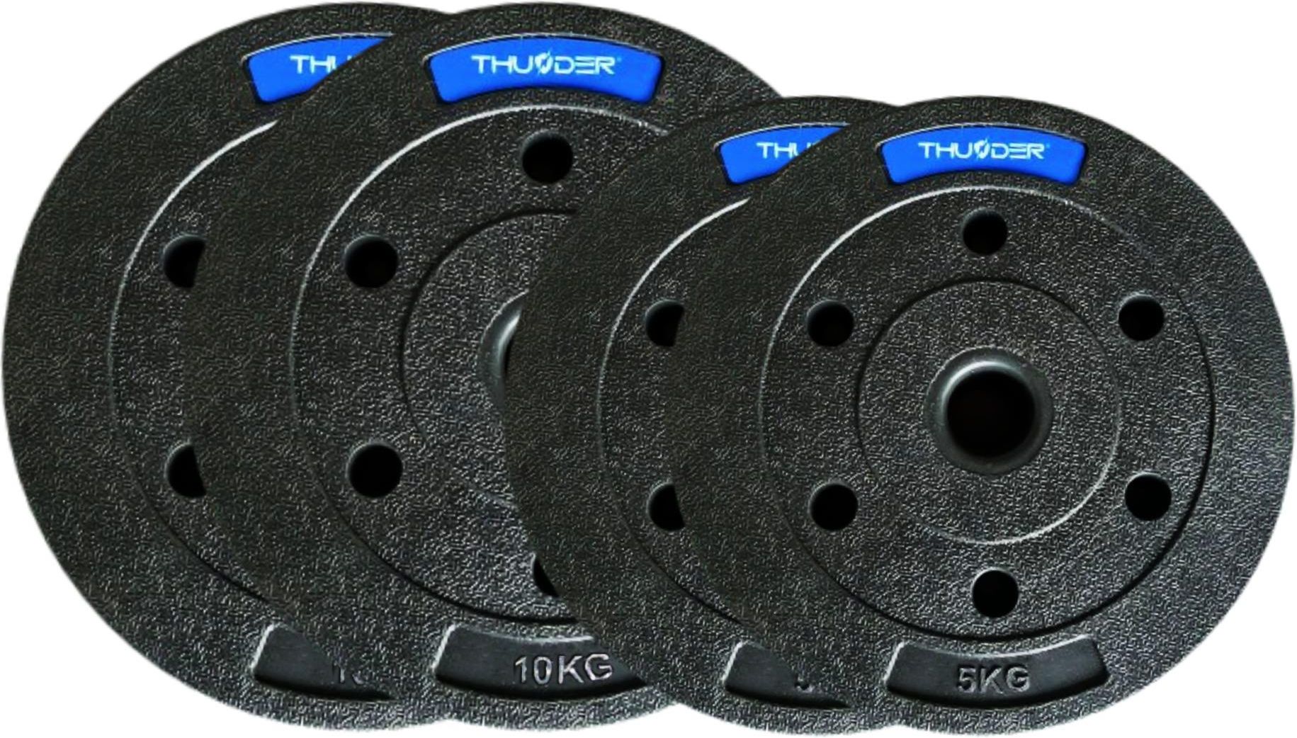 Zestaw treningowy SET-B-05-30KG marki ⚡THUNDER®️⚡- profesjonalny sprzęt do ćwiczeń ✅PARAMETRY OBCIĄŻENIA: ➡️Waga: 30 kg ✅Zestaw zawiera: ➡️ 2x10 kg ➡️Średnica otworu: 31 mm ➡️ 2x5 kg ➡️Średnica otworu: 31 mm ✅SOLIDNE WYKONANIE ➡️Obciążenie wykonane jest z kompozytu cementu i piachu. Z zewnątrz powleczone jest warstwą ochronną z tworzywa sztucznego pełniącą rolę wygłuszającą oraz amortyzującą. ➡️Talerze kompozytowe posiadają tłoczone oznaczenia wagi. Pasują do większości gryfów dostępnych na rynku. ✅ ZALETY ➡️Idealny do treningu siłowego w zaciszu domowym. ➡️Ciężary kompozytowe zapewniają duży komfort treningu, głównie dzięki grubej warstwie wygłuszającej. ➡️Logowania w kolorze niebieskim dodają talerzom unikalnego charakteru.