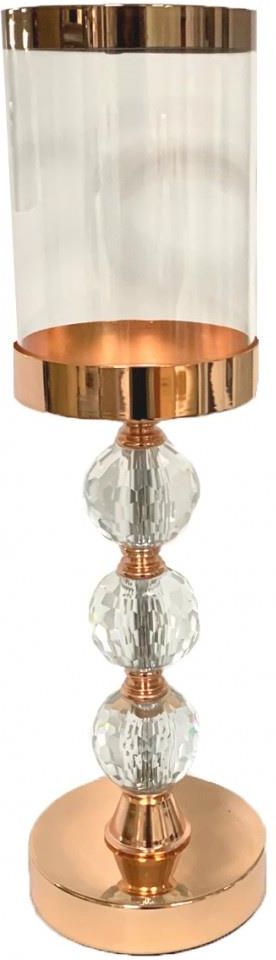 Elegancki świecznik - lampion marki TOM. Wysokość lampionu 39 cm. Składa się on z dwóch części: chromowanej, złotej (odcień różowego złota), błyszczącej nogi ozdobionej trzema przeźroczystymi kulami w formie kryształu oraz szklanego klosza ze złotym, górnym rantem. Uroczy świecznik to idealne rozwiązanie do wnętrza. Znajdzie on swoje zastosowanie jako ozdoba pokoju dziennego, salonu czy też nawet sypialni. Wyszukane drobiazgi sprawiają, że pomieszczenia stają się bardziej przytulne i dużo chętniej w nich odpoczywamy. Świeczniki i ozdoby pomogą w prosty sposób ożywić każde wnętrze. Wzór: LCS24-3 Produkt 1 x metalowy stojak 1 x szklany klosz Wymiary średnica: 11 cm wysokość: 39 cm klosz średnica: 10 cm klosz wysokość: 15 cm Materiał tworzywo sztuczne szkło Użytkowanie wystrój wnętrza