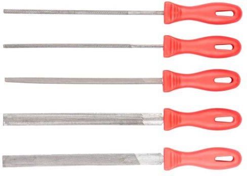 Pilniki do metalu, zestaw 5 szt. 06A650 TOP TOOLS Zestaw pilników do metalu TOP TOOLS (nr ref. 06A650). Przeznaczone głównie do precyzyjnego szlifowania metalu. Pięć uniwersalnych kształtów pozwala na różnorodne zastosowanie. Rękojeść z tworzywa o ergonomicznym kształcie bardzo dobrze leży w dłoni, co zapewnia wysoki komfort pracy.