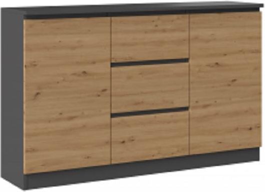 Komoda Olympia to mebel idealny do pokoju dziennego, salonu lub sypialni. Kolor mebla antracyt/dąb artisan wpasuje się w wiele aranżacji w nowoczesnych wnętrzach jak również we wnętrzach klasycznych. Szafka posiada komplet szuflad i drzwiczki dzięki czemu ma łatwy dostęp do wnętrza oraz odpowiednią przestrzeń do przechowywania odzieży lub innych przedmiotów. Płyta laminowana to płyta, z której wykonano komodę. Komodę można połączyć z biurkiem Cora lub z innymi meblami z kolekcji tworząc w ten sposób ciekawe zestawienie. Komoda to doskonały dodatek w każdym pomieszczeniu W swojej ofercie posiadamy duży wybór komód. Posiadamy modele mebli w rożnych kolorach oraz w różnych rozmiarach. Oferujemy komody do każdego wnętrza; eleganckie komody do salonu, nowoczesne komody, komody do pokoju dziecięcego, do jadalni, komody z szufladami, komody wysokie. Dostępne są również komody pokojowe posiadające oświetlenie oraz komody wykonane z drewna. Przy zakupie komody ważna jest nie tylko jakość wykonania ale również jej funkcjonalność. Wybierz mebel odpowiedni to twojej przestrzeni Komody są doskonałym wyborem do każdego pomieszczenia. To dodatkowe miejsce do przechowywania. Świetnie sprawdzą się do przechowywania ubrań w pokoju dziecięcym, pokoju młodzieżowym, przedpokoju, salonie, sypialni czy garderobie. Są funkcjonalne, pojemne, posiadają półki, szafki, szuflady w których pomieścisz bieliznę, zabawki lub inne akcesoria. Stolik pod telewizor, to również funkcja jaką może pełnić komoda.