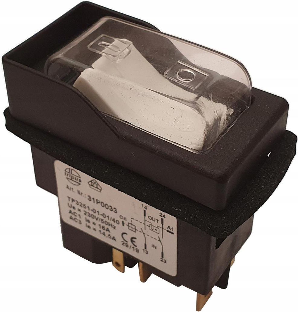 Wyłącznik elektromagnetyczny firmy Tripus Wyłącznik stosowany w urządzeniach z silnikiem jednofazowym. DANE TECHNICZNE napięcie 230 V / 50Hz styki podłączeniowe - wsuwka x 5 osłona bryzgoszczelna na przyciskach zanikowo-napięciowy certyfikat CE PASUJE DO WIELU URZĄDZEŃ betoniarki, wiertarki, …