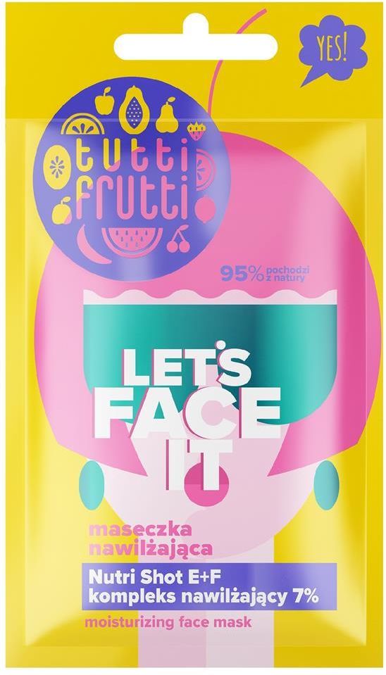 Tutti Frutti Let's Face It Nawilżająca maseczka z kompleksem nawilżającym 7% + Nutri Shot E+F, 7g Właściwości produktu:- intensywnie nawilża i zmiękcza skórę- zapewnia odczuwalne odżywienie- o zapachu mango i trawy cytrynowej- ekspresowo się wchłania- 95% składników pochodzenia naturalnego- 100% vege