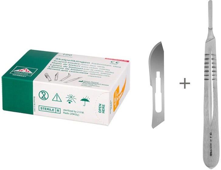 Ostrza do Skalpela nr.19 10x10szt + Uchwyt nr.4 Ostrza do skalpela produkcji niemieckiej (Heinz Herenz Hamburg) Pakowane sterylnie po 1 szt. W zestawie gratis uchwyt do ostrzy Nr 3
