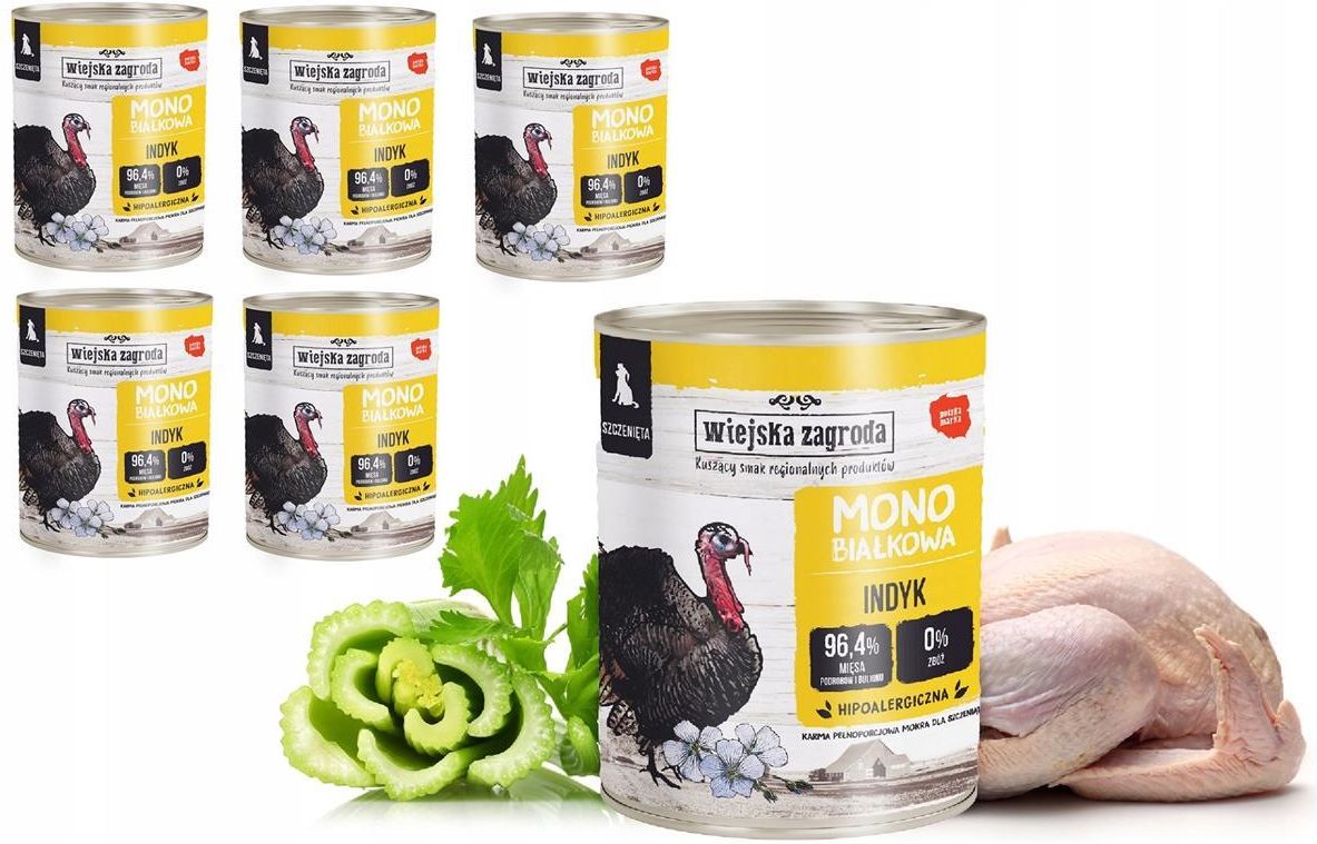 Pakiet Wiejska Zagroda Monoproteinowa Mokra Karma Dla Szczeniąt Indyk 6 x 800 gWIEJSKA ZAGRODA MONOPROTEINOWA MOKRA KARMA DLA SZCZENIĄT INDYK 800 G Poznajcie monoproteinowe karmy mokre Wiejska Zagroda dla szczeniąt. Każda puszka zawiera jeden rodzaj mięsa, które plasuje się na pierwszym miejscu każdego składu! To także wyjątkowe superdodatki w postaci owoców lub warzyw oraz ziół, które pełnią dodatkowe role w dbaniu o zdrowie mocny organizm psiaka. Karmy stanowią świetny wybór dla wybrednych pupili. Podając naprzemiennie różne źródła białek obserwujemy, którymi najchętniej zajada się nasz Czworonożny Przyjaciel. Idealnie sprawdzą się dla wrażliwych psów oraz tych, które zmagają się z alergiami pokarmowymi – podawanie szczeniakowi karmy tylko z jednym, określonym typem białka pozwala na obserwacje jego zachowania oraz kondycji skóry. Dzięki temu łatwo można wykluczyć składniki, które powodują niepożądane reakcje. Szeroki wybór mięs sprawia, że każdy psiak znajdzie w naszym menu coś dla siebie! Główne zalety produktu: mięso na pierwszym miejscu w składzie 96,4% mięsa, podrobów i bulionu niski poziom węglowodanów – od 7,4% do 10,1% w suchej masie w zależności od formuły bez zbóż, bez glutenu z dodatkiem zdrowych warzyw lub owoców oraz ziół każda formuła ma swoje unikalne właściwości! dokładnie opisany, prosty i krótki skład polska marka