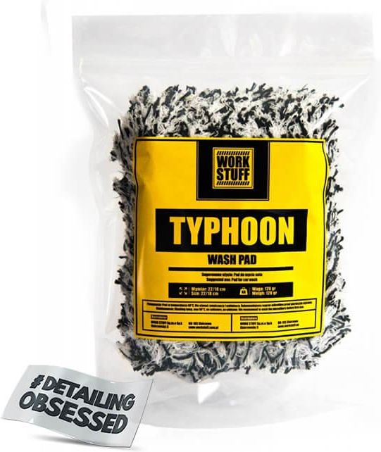 Work Stuff Typhoon Wash Pad Typhoon Wash Pad to stworzony z najlepszej jakości materiałów pad z mikrofibry do mycia samochodu. W nowej wersji pad jest sporo cieńszy i co ważniejsze w składzie znajdziemy nowy materiał Viscoza, który w porównaniu do poprzedniej wersji pada cechuje się zwiększona trwałością, większą delikatnością i trwałością. Najważniejsze cechy: niezwykła chłonność,gęsta i delikatna mikrofibra wyprodukowana w Korei,duża powierzchnia myjąca,poręczny kształt,perfekcyjnie wykończony.Typhoon Wash Pad to jeden z najlepszych padów do mycia dostępny na rynku. Uwaga! Przed pierwszym użyciem zalecamy wypranie produktu.Rozmiar: 22/18 cm Waga:120 g Do każdego zamówienia otrzymasz naklejkę #DETAILING OBSESSED w losowym kolorze gratis!