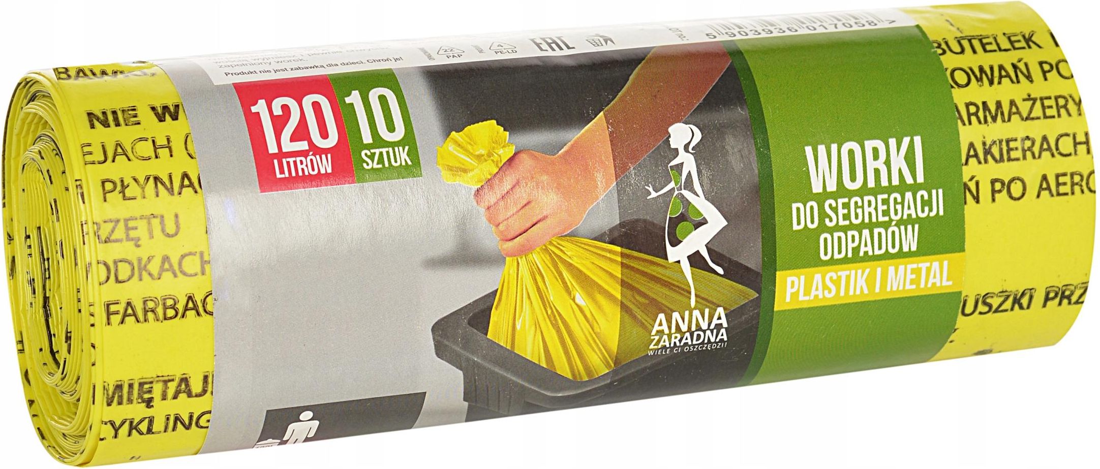 Worki do segregacji odpadów ANNA ZARADNA, metal, plastik, 120 l, 10 szt., żółte wykonane z regranulatu pochodzącego z recyklingu odpadów foliowych nadają się do ponownego recyklingu do pakowania i segregowania odpadów z plastiku i metalu można do niego wrzucić: plastikowe butelki po napojach i …