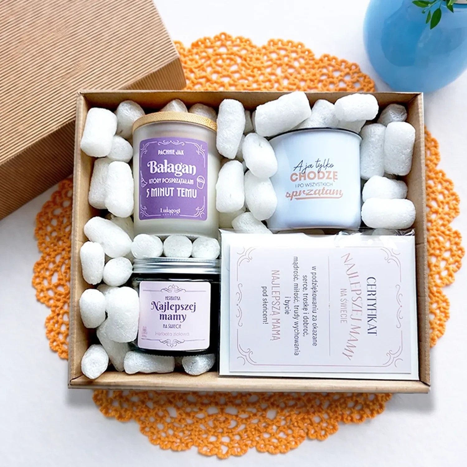 Szukasz wyjątkowego prezentu dla mamy? Ten zestaw to idealne połączenie humoru, ciepła i chwili relaksu. Starannie skomponowany komplet sprawi, że każda mama poczuje się doceniona – a przy okazji może się uśmiechnąć. Całość zapakowana jest w eleganckie pudełko prezentowe wypełnione dekoracyjnym wypełniaczem, dzięki czemu zestaw wygląda pięknie już po otwarciu i jest gotowy do wręczenia bez dodatkowego pakowania. W zestawie znajduje się: Kubek emaliowany z napisem: A ja tylko chodzę i po wszystkich sprzątam Świeca zapachowa z napisem: Pachnie jak bałagan, który posprzątałam 5 minut temu Herbata z napisem:Herbatka najlepszej mamy na świecieKartka okolicznościowa Certyfikat Najlepszej Mamy – wyjątkowy dodatek, który podkreśla jak ważna jest mama. Piękne opakowanie Wszystkie elementy zestawu umieszczone są w estetycznym pudełku prezentowym z naturalnej tektury, wypełnionym dekoracyjnym wypełniaczem. Całość tworzy elegancki i gotowy do wręczenia prezent.