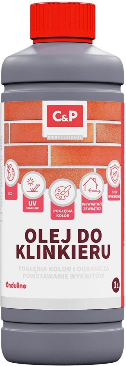 Onduline Olej do klinkieru C&P 1l Olej do klinkieru to nowoczesny, wysokiej jakości paroprzepuszczalny impregnat olejowy do stosowania wewnątrz i na zewnątrz. Olej do klinkieru C&P przeznaczony jest do impregnowania powierzchni wykonanych z ceramiki np. klinkieru. Zdecydowanie ogranicza nasiąkliwość, chroni przed działaniem warunków atmosferycznych i korozją oraz rozwojem mikroorganizmów. Olej do klinkieru nie tworzy powłoki. Przed użyciem należy zapoznać się z kartą techniczną produktu oraz wykonać próbę na niewielkiej powierzchni, w mało widocznym miejscu celem sprawdzenia działania. Oceny dokonać po całkowitym wyschnięciu impregnatu. PRZYGOTOWANIE POWIERZCHNI: Odpowiednie przygotowanie podłoża jest warunkiem prawidłowo wykonanej impregnacji. Powierzchnia ta powinna być sucha, czysta i niezatłuszczona. Jeżeli podłoże było już wcześniej zaimpregnowane, impregnaty i powłoki należy usunąć za pomocą odpowiedniego środka. Polecamy do umycia przed impregnacją użycie: Środek do mycia kostki brukowej C&P. W przypadku nowo wykonanych ogrodzeń i elewacji, odczekać z impregnacja do całkowitego wyschnięcia spoin i zaprawy klejącej. Powierzchnie niezabezpieczone do impregnacji należy zabezpieczyć przed zachlapaniem. SPOSÓB UŻYCIA: Produkt gotowy do użycia nie należy go rozcieńczać. Używać wyłącznie w rękawicach i okularach ochronnych. Wzmocnienie koloru zależy od nasączenia powierzchni impregnatem. Preparat nakładać jednokrotnie, obficie za pomocą wałka, pędzla lub natryskiem niskociśnieniowym. Powierzchnia powinna być nasycona równomiernie i dokładnie. Nadmiar impregnatu w postaci kropli rozetrzeć wałkiem lub pędzlem. Nie pozostawiać nadmiaru do wyschnięcia. Impregnację należy wykonywać w temp. od Ƴ°C do + 30°C, podczas suchej i bezdeszczowej pogody. Nie stosować przy silnym nasłonecznieniu. WYDAJNOŚĆ: Zużycie preparatu zależy od struktury materiału oraz sposobu aplikacji i wynosi średnio ok. 12m 2 z 1 litra.