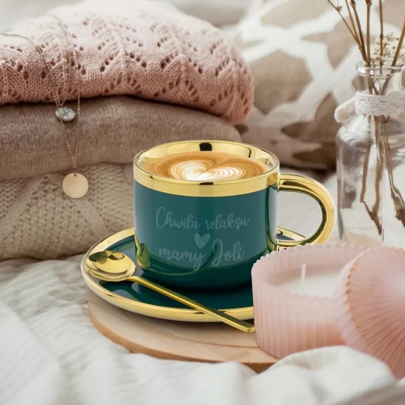 Filiżanka ze spodkiem i łyżeczką ozdobiona jest pięknym złoceniem, dodając elegancji i szyku do każdego popołudnia. Prezent idealny dla każdej mamy, która lubi delektować się chwilą relaksu przy filiżance ulubionej kawy lub herbaty. Dzięki temu podarunkowi każda mama będzie mogła cieszyć się wyjątkowym momentem relaksu i zadbać o siebie w piękny i elegancki sposób. Parametry Filiżanka ze spodkiem materiał: 100% kamionka kolor: zielony złote elementy średnica talerzyka: 15 cm wysokość filiżanki: 8 cm pojemność: 200 ml zapakowane w firmowy kartonik nie można myć w zmywarce laserowy grawer personalizacji złote elementy malowane są ręcznie, dlatego każda filiżanka jest wyjątkowa i unikatowa Łyżeczka materiał: stal nierdzewna kolor: złoty długość: 14 cm Personalizacja Aby w pełni spersonalizować prezent, skorzystaj z naszego edytora. Wprowadź odpowiednie dane, a nasi graficy zajmą się resztą.