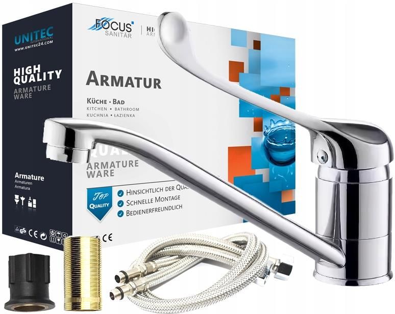 WYSOKIEJ JAKOŚCI BATERIA W KOLORZE SREBRNYM Z OBROTOWĄ WYLEWKĄ ORAZ DŁUGIM UCHWYTEM - BATERIA ŁOKCIOWA NOWY MODEL, W kolorze chrom - połysk. Model PREMIUM z serii FOCUS SANITARY + ZESTAW MONTAŻOWY Nowe tendencje w architekturze, modzie i stylu życia wpływają na to, jak wyglądają i zmieniają się współczesne wnętrza. One z kolei modyfikują nasze przyzwyczajenia i to, jak z nich korzystamy. Coraz częściej łazienki i kuchnie stają się wielofunkcyjnymi salonami – przy ich urządzaniu wyrażamy naszą osobowość i pokazujemy, co naprawdę jest dla nas ważne. Staranny proces produkcji i wysoka jakość użytych materiałów zapewni bezproblemowe użytkowanie przez długi czas. Model zaprojektowany w nowoczesnym, ale klasycznym stylu sprawdzi się w każdym wnętrzu. Bateria charakteryzuje się bardzo dużą odpornością na zarysowania i wysokie temperatury. Modele PREMIUM z serii FOCUS SANITARY z powodzeniem sprzedawane na rynku niemieckim. Dane techniczne ▶️ Kolor: chrom połysk ▶️ Wykonana ze stopów cynku i mosiądzu ▶️ Ceramiczna głowica ▶️ W komplecie zestaw instalacyjny (podkładki, uszczelki, wężyki, śrubki) ▶️ Obrotowa wylewka 360° ▶️ Wymienny perlator oszczędzający wodę ▶️ Otwór montażowy: 35mm standard Prezentujemy Państwu elegancką i stylową baterię z obrotową wylewką. Model zaprojektowany w nowoczesnym, ale klasycznym stylu sprawdzi się w każdym wnętrzu. Jest to o produkt, który pozwala na zachowanie higieny i z tego powodu znajduje ona swoje zastosowanie w gabinetach, a także centrach handlowych. Dzięki zastosowaniu nowatorskiej technologii bateria umożliwia precyzyjną regulację ilości przepływu i temperatury wody. Powierzchnia baterii została wykonana z najwyższej jakości chromu charakteryzującego się wysokim połyskiem oraz odpornością na odbarwienia i zmatowienia. Bezproblemowy montaż W zestawie otrzymają państwo wszystkie niezbędne elementy do zamontowania baterii: dwa wężyki, uszczelki oraz śrubki. Prosty i szybki montaż bez pomocy hydraulika ⚡️⚡️ Dzięki swojej konstrukcji pozwala na komfortowe użytkowanie przy umywalkach oraz zlewach jednokomorowych i dwukomorowych. Model, który wyróżnia się ponadprzeciętną funkcjonalnością. Świetnie sprawdzi się w domowej kuchni, a także w miejscach użyteczności publicznej takich jak salony kosmetyczne, biura czy inne pomieszczenia usługowe. Nasze baterie to przede wszystkim wygoda użytkowania, a także nieoczywista forma, która swoim designem doskonale wpisuje się w najnowsze trendy.