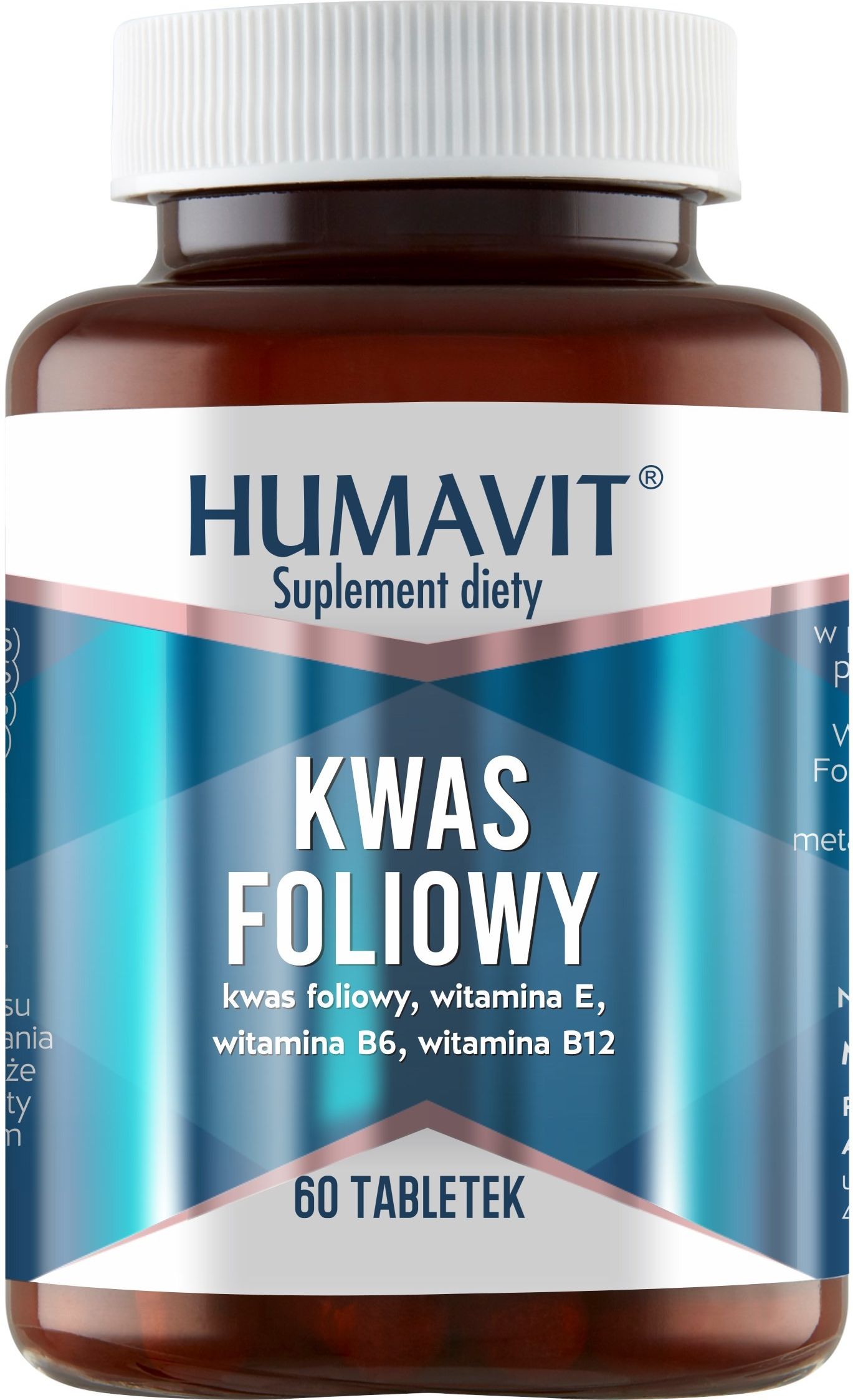 HUMAVIT®  KWAS FOLIOWY (60 tabletek) Produkt zawiera kwas foliowy, witaminy B6 i B12, witaminę E. Witaminy B6 i B12 pomagają w prawidłowym funkcjonowaniu układu nerwowego, prawidłowej produkcji czerwonych krwinek, utrzymaniu prawidłowych funkcji psychologicznych, zmniejszeniu uczucia zmęczenia i znużenia. Witamina B6 wspiera prawidłowy metabolizm białka i glikogenu. Foliany przyczyniają się do prawidłowego rozwoju płodu w czasie ciąży, prawidłowej syntezy aminokwasów, prawidłowego metabolizmu homocysteiny, biorą udział w procesie podziału białek i chronią przed wadami wrodzonymi. Witamina E pomaga w ochronie komórek przed stresem oksydacyjnym. Składniki:  substancja wypełniająca (celuloza), skrobia ziemniaczana, octan d-alfa tokoferylu (witamina E), chlorowodorek pirydoksyny (witamina B6), metylokobalamina (witamina B12), kwas pteroilomonoglutaminowy (forma kwasu foliowego). Informacja żywieniowa: 1 tabletka *RWS Witamina E 12 mg 100% Witamina B6 1,4 mg 100% Kwas foliowy 400 µg 200% Witamina B12 2,5 µg 100% *RWS — Referencyjna Wartość Spożycia Masa netto produktu: 22 g Ilość tabletek w opakowaniu: 60 Ilość porcji w opakowaniu: 60 Wielkość porcji: 1 tabletka Kod EAN: 5903129300325 Kod BLOZ: 8077111 Zalecane spożycie: 1 tabletka dziennie po posiłku, popić wodą (minimum 200ml). Nie należy przekraczać zalecanej dziennej porcji. Uwaga: Produkt przeznaczony dla dorosłych. Spożywanie kwasu foliowego  jest szczególnie zalecane w okresie planowania ciąży, w czasie samej ciąży i karmienia piersią. Suplement diety nie może być stosowany jako substytut zróżnicowanej i zbilansowanej diety oraz nie zastąpi zdrowego trybu życia. Przechowywać w suchym miejscu, w temperaturze pokojowej, w sposób niedostępny dla małych dzieci. Producent i podmiot odpowiedzialny:  GOLDSTUDIO Adam Rudziński ul. Żwirki i Wigury 56B, 43-190 Mikołów NIP: 969 139 67 83 www.humavit.pl | biuro@humavit.pl