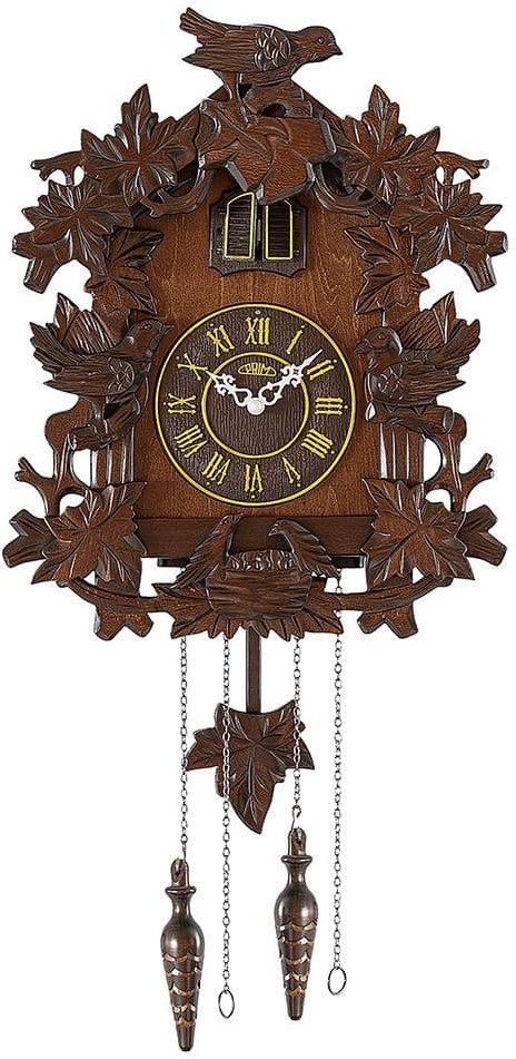 Drewniany ręcznie rzeźbiony zegar ścienny retro z drewna lipowego w kształcie domku dla ptaków Prim E07P.4596.52. Mechanizm kwarcowy z wahadłem i kukułką. Czujnik zmierzchu. Regulacja głośności. Wymiary 36 x 45 cm (78 cm z szyszkami)