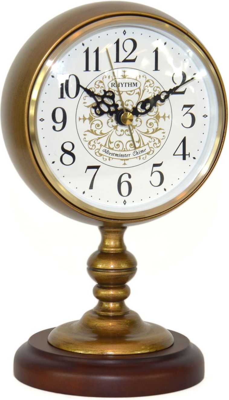 Klasyczny czytelny drewniano-metalowy okrągły stojący zegar kominkowy retro RHYTHM CRH269NR18 z wyraźnymi cyframi arabskimi Mechanizm kwarcowy. Kuranty, Westminster, melodie klasyczne i świąteczne, regulacja głośności, ładny, czysty dźwięk. Wysokość 23 cm