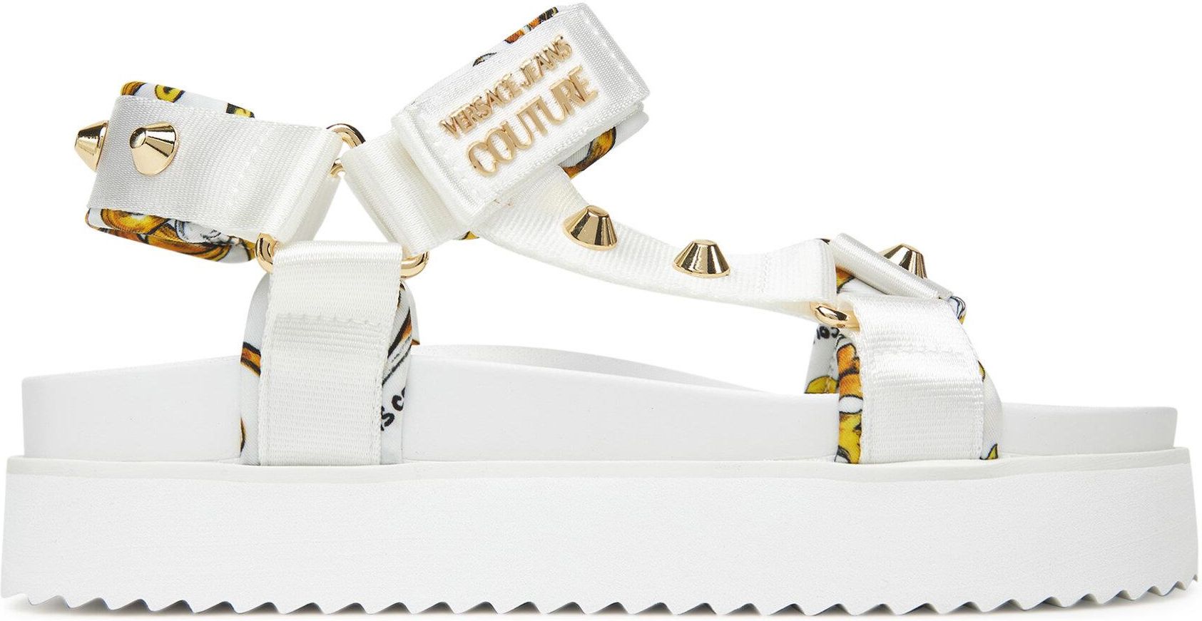 Sandały Versace Jeans Couture to doskonały wybór dla kobiet ceniących styl i wygodę. Wykonane z wysokiej jakości materiału włókienniczego, zachwycają unikalnym designem, który doskonale wpisuje się w najnowsze trendy. Zapięcie na rzep zapewnia idealne dopasowanie oraz łatwość zakładania, co sprawia, że są niezwykle praktyczne na co dzień. Ten model to świetne uzupełnienie letnich stylizacji, gwarantujące wygodę i wyjątkowy wygląd, który przyciągnie spojrzenia. Idealne na każdą okazję!