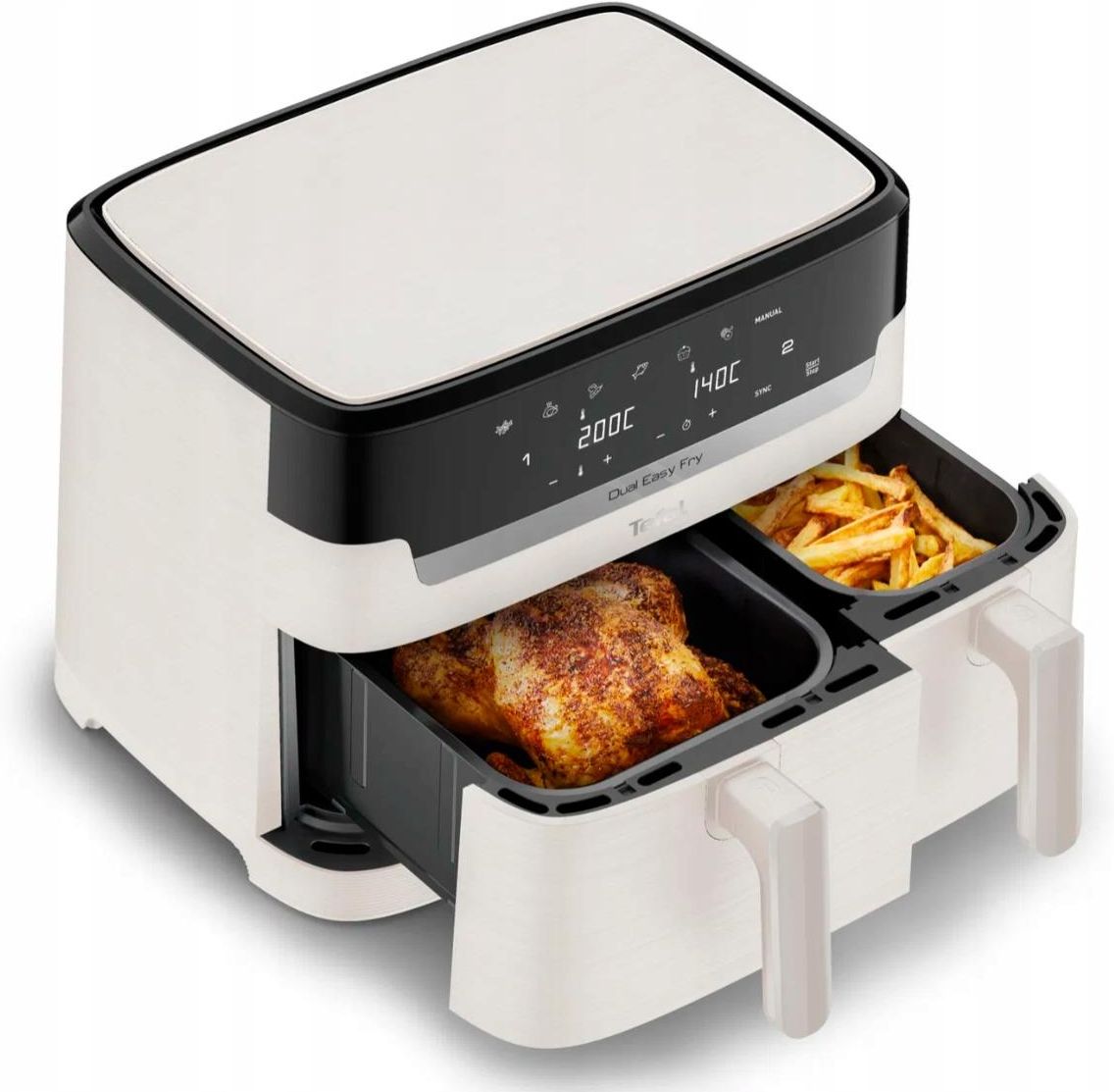 Tefal EY901AE0 Dual Easy Fry Essential Biały Frytkownica na gorące powietrze Tefal EY901AE0 Dual Easy Fry Essential White to idealny wybór dla rodzin i wszystkich, którzy chcą przygotowywać kompletne posiłki szybko, wygodnie i w zdrowszy sposób. Urządzenie jest wyposażone w dwa oddzielne kosze o łącznej pojemności 8,3 litra. Większy kosz 5,2 l (XXL) nadaje się również do przygotowywania dużych porcji, na przykład całego kurczaka, podczas gdy mniejszy kosz 3,1 l nadaje się do przystawek lub mniejszych potraw. Dzięki temu można przygotować dwa różne posiłki jednocześnie. Frytkownica wykorzystuje technologię Extra Crisp, która zapewnia optymalną równowagę temperatury i cyrkulacji gorącego powietrza. Rezultatem są chrupiące i równomiernie upieczone potrawy z minimalną ilością tłuszczu lub całkowicie bez niego. Dostępnych jest 7 automatycznych programów, a także możliwość ręcznego ustawienia czasu i temperatury w zakresie 40–200 °C. Funkcja synchronizacji pozwala na zakończenie przygotowywania obu potraw w tym samym czasie, co znacznie ułatwia przygotowanie całego menu. Frytkownica na gorące powietrze jest szybsza i bardziej energooszczędna niż klasyczny piekarnik, a jednocześnie bardzo łatwa do czyszczenia - kosze i kratki nadają się do mycia w zmywarce. Urządzenie jest wyposażone w cyfrowy ekran dotykowy, automatyczne wyłączanie i zabezpieczenia zapewniające wygodne i bezpieczne użytkowanie. Główne cechy: dwa oddzielne kosze całkowita pojemność 8,3l Technologia Extra Crisp 7 programów automatycznych Regulacja temperatury 40–200 °C tryb synchronizacji do przygotowania dwóch potraw cyfrowy ekran dotykowy części przystosowane do mycia w zmywarce Pobór mocy 2700 W