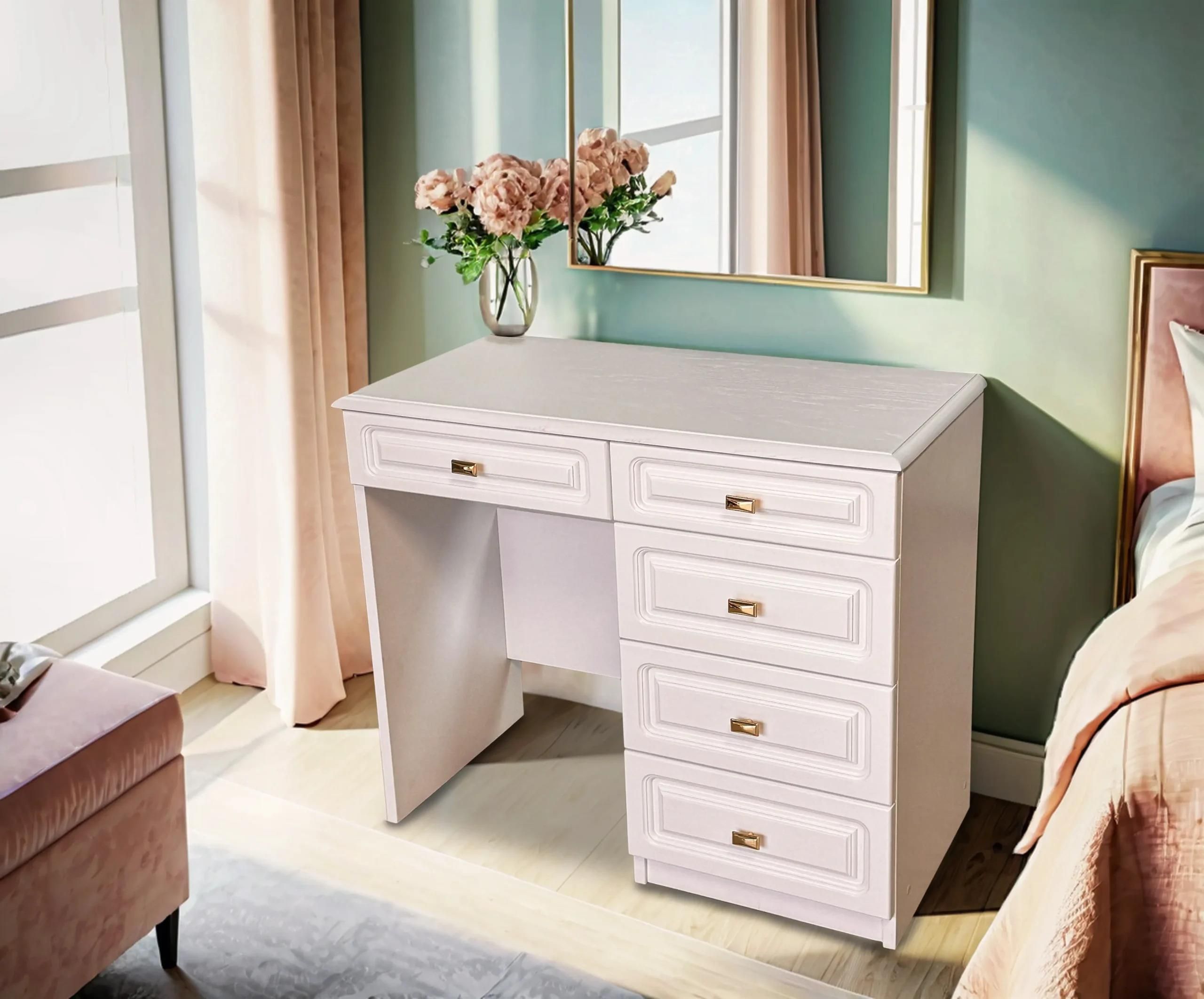 Toaletka Fala 5s złote uchwytyZdjęcie przedstawia realny wygląd produktu. Nie jest wizualizacją komputerową. Nowoczesna toaletkaToaletka Dębowa 5s w stylu skandynawskim to elegancki i funkcjonalny mebel do sypialni. Posiada białe wykończenie oraz złote uchwyty, które nadają jej subtelną, ale wyrazistą estetykę. Wymiary komody to szerokość 110 cm, a jej praktyczność zapewniają 5 pojemnych szuflad, idealnych do przechowywania. Dzięki prostemu, ale stylowemu designowi, doskonale wpasuje się w nowoczesne wnętrza.Wymiary: Szerokość: 110 cm Realizuję również meble na indywidualne zamówienie (wymiary, strony, szycia, wzory, układy, wybarwienia listew wykończeniowych itp.). Dysponujemy tkaninami plamoodpornymi łatwo czyszczącymi firmy Fargotex i wielu innych producentów. WYBARWIENIA DREWNA Naszym priorytetem jest dokonanie wszelkich starań, aby Nasi klienci byli zadowoleni.Meble wykonane są z wysokiej jakości polskich materiałów. Aby uzyskać więcej informacji, proszę o kontakt z naszymi sprzedawcami: Tel: 788 509 803Tel: 661 442 118 Istnieje możliwość obejrzenia oferowanych przez naszą firmę mebli przez 6 dni w tygodniu. Od poniedziałku do piątku w godzinach 8:00-17:00 oraz w sobotę od godziny 8:00 do 12:00 w siedzibie naszej firmy. UWAGA! WNOSZENIE TOWARU W ZAKRESIE KLIENTA! MEBLE MIESZCZĄ SIĘ W DRZWIACH 80 CM.Czas realizacji zamówienia od 3 do 6 tygodni. Możliwy szybszy czas realizacji, jeśli dany model znajduje się na stanie magazynowym.