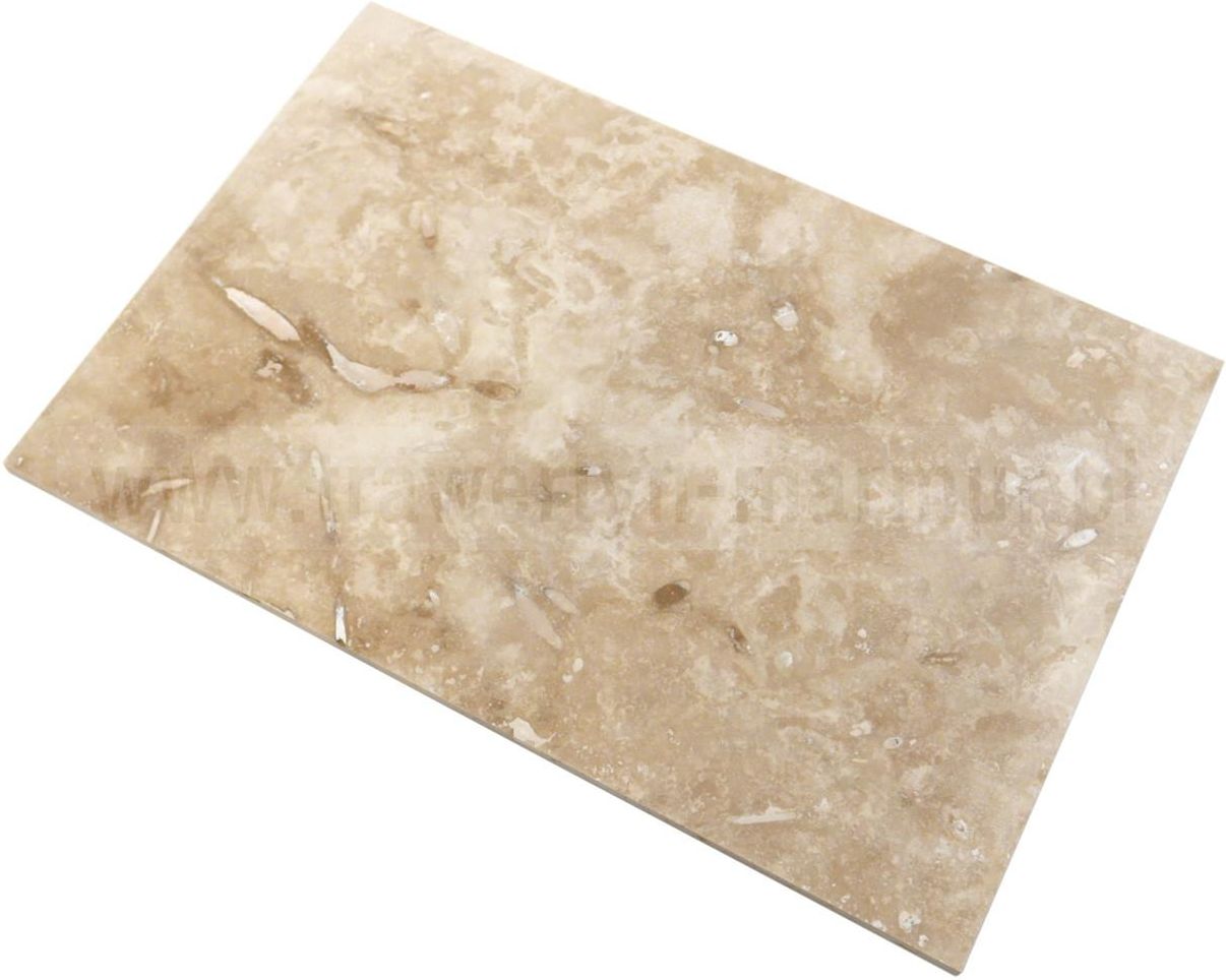 Trawertyn płytki Ivory Onyx H/F 40,6cm x 61cm x 1,2cm Materiał: trawertyn (kamień naturalny) Kolekcja: Ivory Onyx H/F Format: 40,6 x 61 cm Grubość: 1,2 cm Kolor: odcienie beżu i brązu Rodzaj: podłogowo-ścienne Wykończenie powierzchni: wypełniana (szpachlowana), matowa Krawędzie: cięte na prosto Zastosowanie: wewnątrz budynków Konserwacja: impregnacja po ułożeniu Kraj pochodzenia i obróbki: Turcja Cena za 1 m2