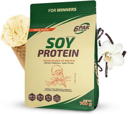 6PAK Soy Protein 700 g Smak: Czekolada-Słony Karmel Cechy 6PAK Soy Protein 700 g Zawiera izolat białka sojowego. Pomaga w odchudzaniu. Wspiera wzrost masy mięśniowej. Przyspiesza regenerację. Przyjazny dla wegan i wegetarian. 6PAK Soy Protein 700 g Odżywka białkowa oparta na łatwo przyswajalnym izolacie białka sojowego, jest całkowicie wolna od składników pochodzenia zwierzęcego, co czyni ją odpowiednią dla osób aktywnych fizycznie, w tym wegetarian i wegan. Produkt wspomaga regenerację mięśni po treningu oraz zwiększa siłę i wytrzymałość podczas ćwiczeń. Ponadto pomaga w redukcji tkanki tłuszczowej, wspierając proces odchudzania. Spożywanie tej odżywki przyczynia się do wzrostu masy mięśniowej, co może przyspieszyć widoczne efekty regularnych treningów. Izolat białka sojowego w tym produkcie charakteryzuje się doskonałym profilem aminokwasowym, co jest jego dużym atutem. Osoby rezygnujące z mięsa i białka zwierzęcego mogą z łatwością sięgnąć po tę odżywkę, aby dostarczyć organizmowi niezbędnych składników odżywczych. Firma 6PAK stworzyła tę odżywkę z myślą o osobach na diecie roślinnej. Sojowa odżywka białkowa od marki 6PAK jest dostępna w formie proszku, który łatwo się rozpuszcza i nie tworzy grudek, co czyni ją smacznym dodatkiem do codziennej diety. Dodatkowo, białko sojowe jest również doskonałym źródłem fitoestrogenów, które mogą mieć korzystny wpływ na zdrowie kości i serca. Dzięki swojej wszechstronności odżywka białkowa 6PAK może być dodawana nie tylko do shake'ów, ale także do smoothie, owsianki, a nawet do wypieków, co zwiększa jej użyteczność w codziennej kuchni. Dla kogo 6PAK Soy Protein 700 g? 6PAK Soy Protein 700 g jest zalecany sportowcom, którzy chcą zmniejszyć tkankę tłuszczową i zwiększyć masę mięśniową. Produkt jest bezpieczny dla sportowców na diecie roślinnej. Składniki odżywcze: na 30 g, % RWS* na 30 g, na 100 g, % RWS* na 100 g Wartość Energetyczna (energia): 485 kJ / 115 kcal, -, 1588 kJ / 376 kcal, - Tłuszcz: 1.2 g, -, 4.0 g, - - w tym kwasy tłuszczowe nasycone: 0.8 g, -, 2.4 g, - Węglowodany: 4.5 g, -, 15 g, - - w tym cukry: 0.9 g, -, 3.0 g, - Błonnik: 3.0 g, -, 10 g, - Białko: 20 g, -, 65 g, - Sól: 0.75 g, -, 2.50 g, - Składniki: izolat białka sojowego (72 %), skrobia kukurydziana NUTRIOSE® (23 %), barwnik (karmel amoniakalny1), aromaty, sól, substancja słodząca (sukraloza), barwnik (karoteny2). Produkt może zawierać: mleko, zboża zawierające gluten, jaja, orzeszki ziemne i orzechy. Dotyczy produktu o smaku: czekolada-solony karmel1, lodów waniliowych2. Produkt może zawierać: mleko, zboża zawierające gluten, jaja, orzeszki ziemne i orzechy. Opakowanie: 700 g Porcja dzienna: 3 razy po 30 g Liczba porcji w opakowaniu: 23 porcje Sposób użycia Zmieszać 1 porcję (30 g) z 300 ml wody. Stosować 3 porcje dziennie. W dni treningowe: I porcja rano po przebudzeniu, II porcja do 1,5 godz. po treningu oraz III porcja przed snem. W dni nietreningowe: I porcja rano po przebudzeniu, II porcja pomiędzy posiłkami oraz III porcja przed snem. Porcja produktu zalecana do spożycia w ciągu dnia to 90 g. Przeciwwskazania Nie zaleca się stosowania przez kobiety w ciąży, matki karmiące piersią oraz osoby uczulone na którykolwiek ze składników produktu. Suplement diety nie może być substytutem (zamiennikiem) zdrowego trybu życia. Nie przekraczać zalecanej dziennej dawki. Przechowywanie Przechowywać w miejscu niedostępnym dla małych dzieci, w temperaturze pokojowej, w zamkniętym opakowaniu i suchym miejscu. Chronić przed bezpośrednim działaniem promieni słonecznych. Podmiot odpowiedzialny: Trec Nutrition Sp. z o.o. NIP: 9581602454, ul. inż. J. Śmidowicza 48, 81-127 Gdynia.