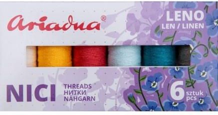 Zestaw nici ARIADNA w poręcznym pudełku. Zawiera 6 kolorów nici Leno 40/70m, 100% len LENO 40 - to nici wykonane w 100% z najwyższej jakości lnu rosnącego we Francji. To najprawdopodobniej najcieńsze nici lniane oferowane w Polsce. Nici LENO 40 są odporne na tarcie i rozciąganie. Charakteryzują się antyalergicznością oraz wysoką chłonnością wilgoci. Jest to produkt biodegradowalny, czyli przyjazny dla środowiska. Nici LENO 40 polecane są do rękodzieła (koronka klockowa), szycia ręcznego m.in. wyrobów z lnu i filcu, przyszywania guzików, obszywania dziurek oraz do modelarstwa. Kolorystyka zestawu: