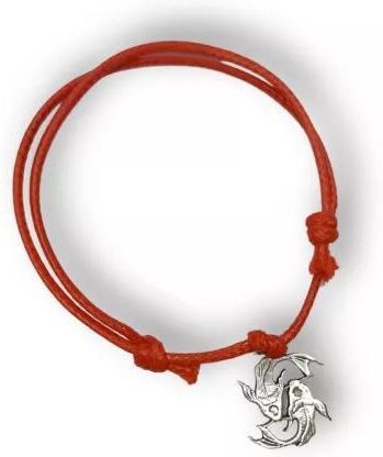 Bransoletka ze srebrnymi rybkami Koi, zawieszonymi na kolorowym rzemyku. W języku chińskim słowo oznaczające rybę brzmi tak samo jak "obfitość" (yu), dlatego ryba jest symbolem bogactwa. Para ryb jest także symbolem harmonii, szczęśliwego pożycia małżeńskiego i możliwości własnego rozwoju, dlatego jest to popularny symbol jako prezent ślubny. Uwaga: Bransoletki mają losowe kolory rzemyka! Zawieszka wykonana jest ze srebra.