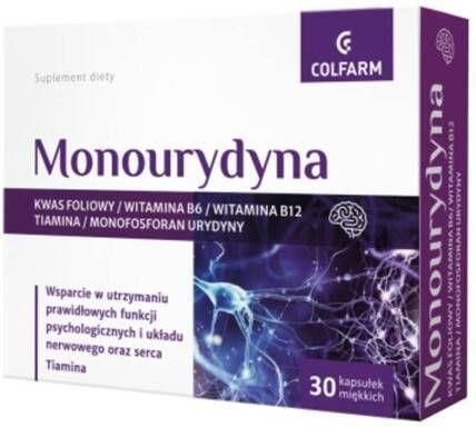 Suplement diety Colfarm, Monourydyna, 30 kapsułek miękkich Wsparcie w utrzymaniu prawidłowych funkcji psychologicznych i układu nerwowego oraz serca Właściwości składników zawiera kwas foliowy, witaminę B6, B12, tiaminę oraz monofosforan urydyny. kwas foliowy przyczynia się do zmniejszenia uczucia …