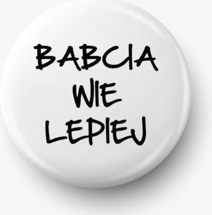 Button z zabawnym tekstem - fajny prezent dla babci z poczuciem humoru.