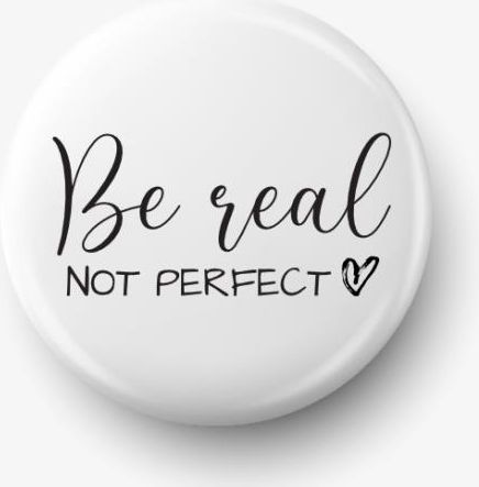 Button na agrafkę z mądrym przesłaniem - "be real, not perfect".